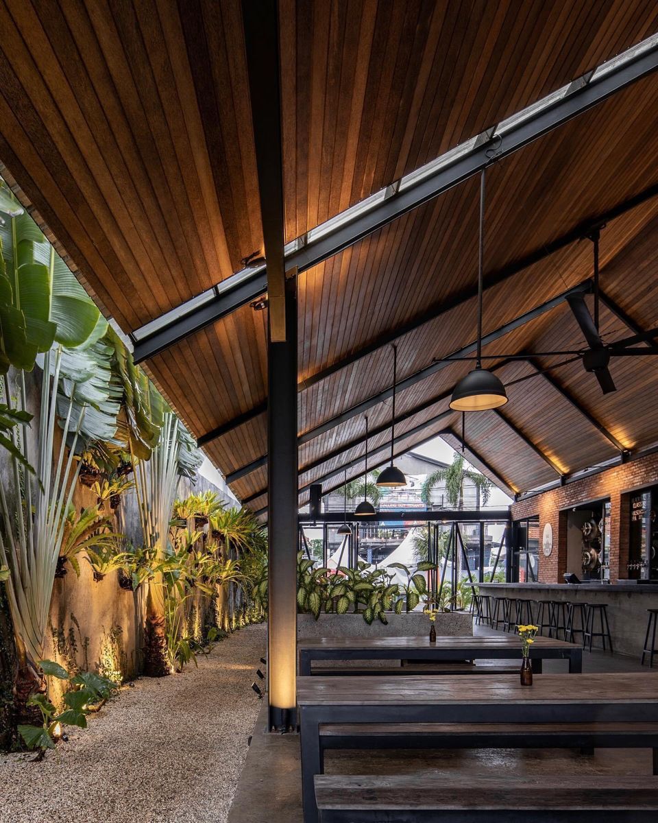 exterior shot black steel frame concrete walls and floors timber accent a lot of greenery city background