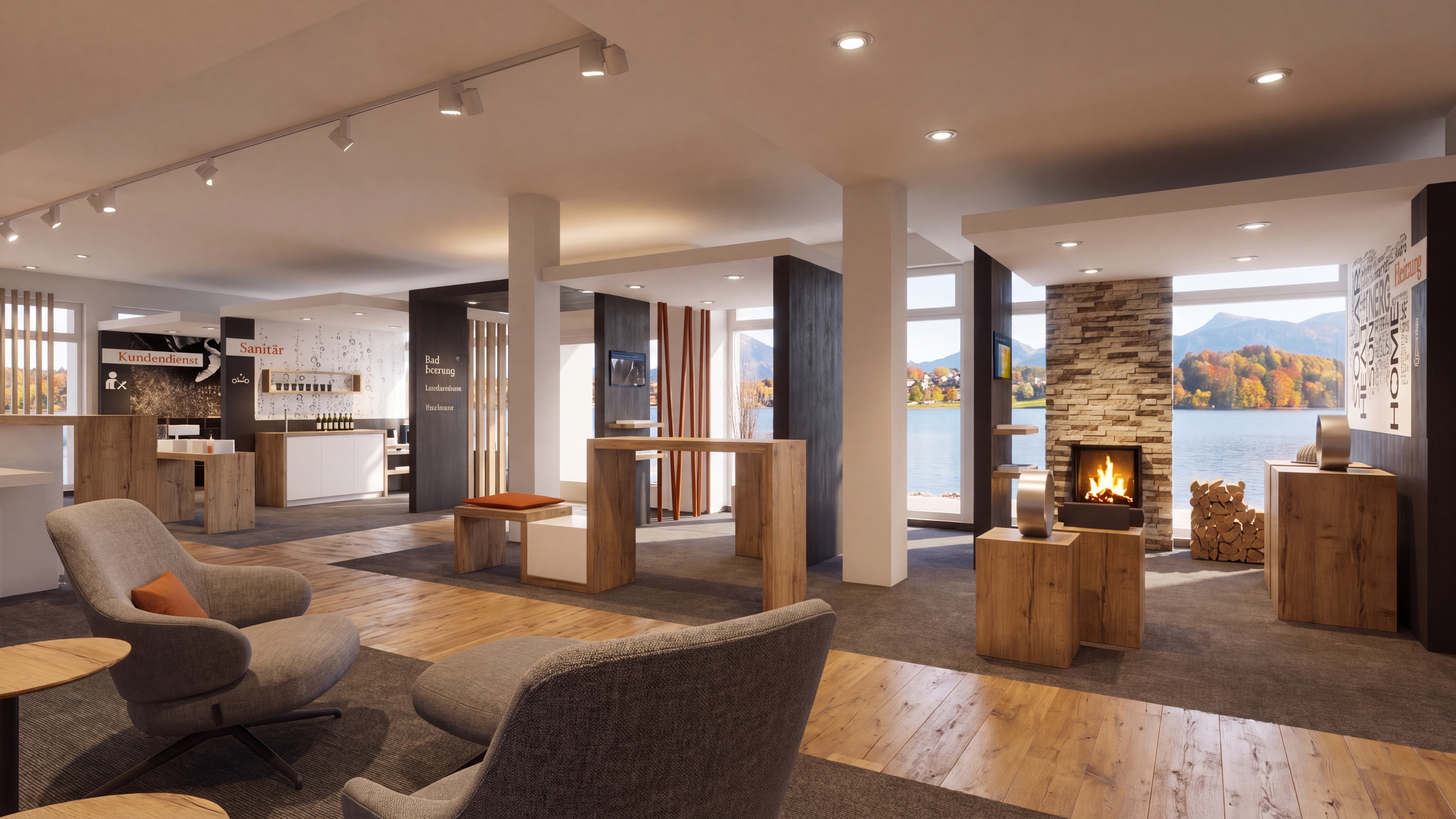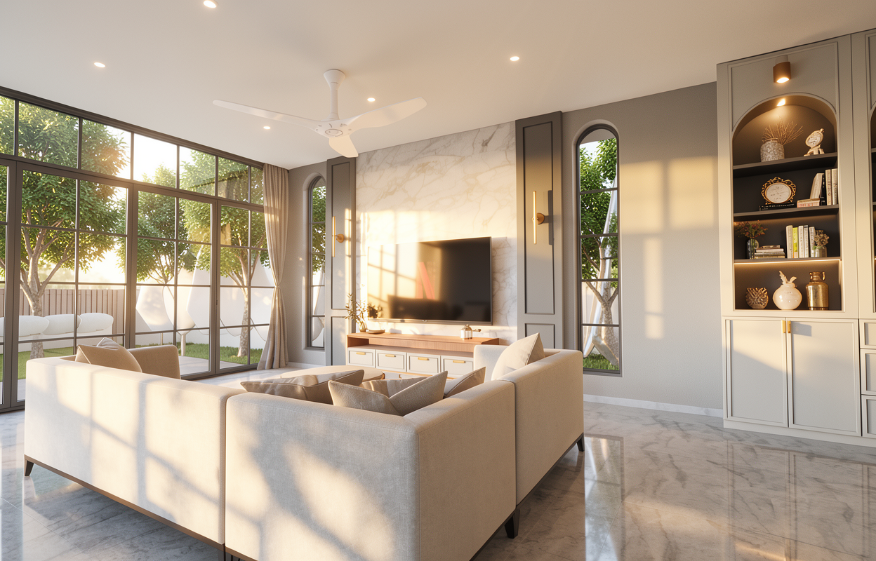 add some trees and bushes outside the doors and windows change the bookshelf on the right to be white in colour change the wall colours to be white change door and window frames to dark grey
