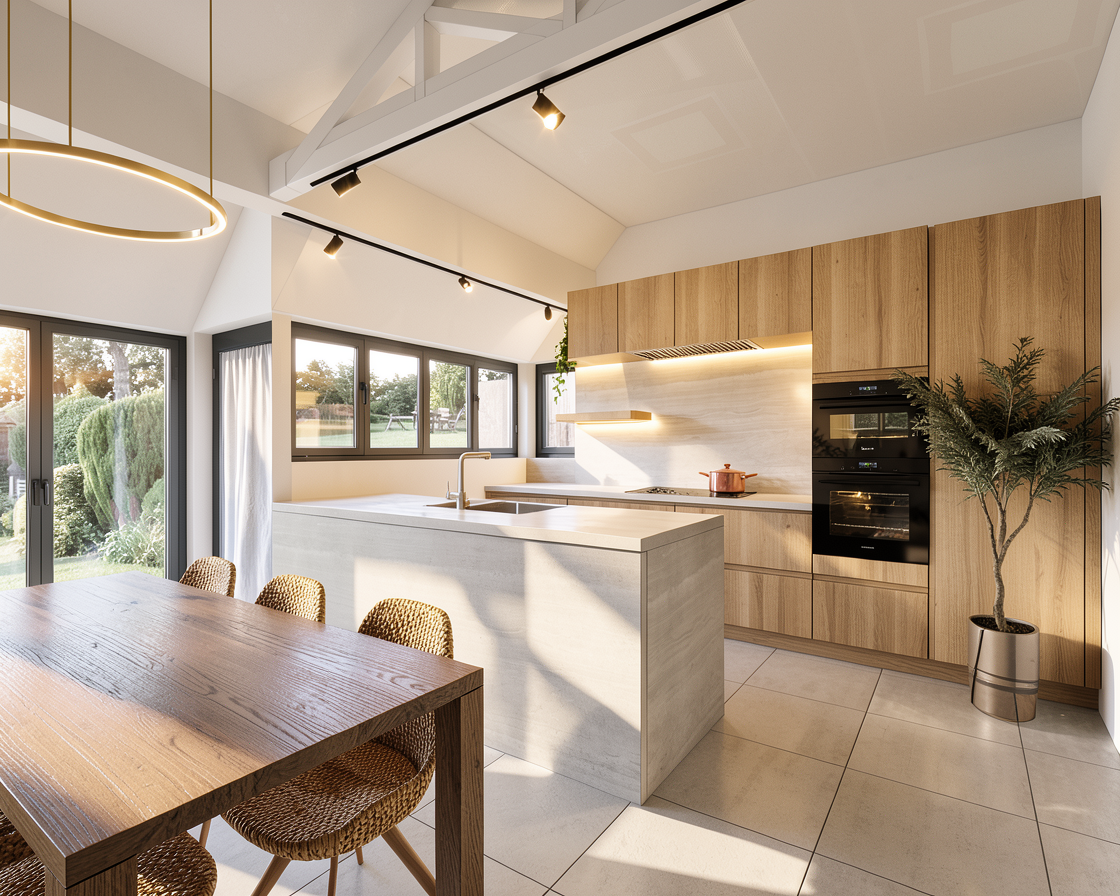 decorate eiland is one block table is in wood the same as the kitchen the wood is lighter wood