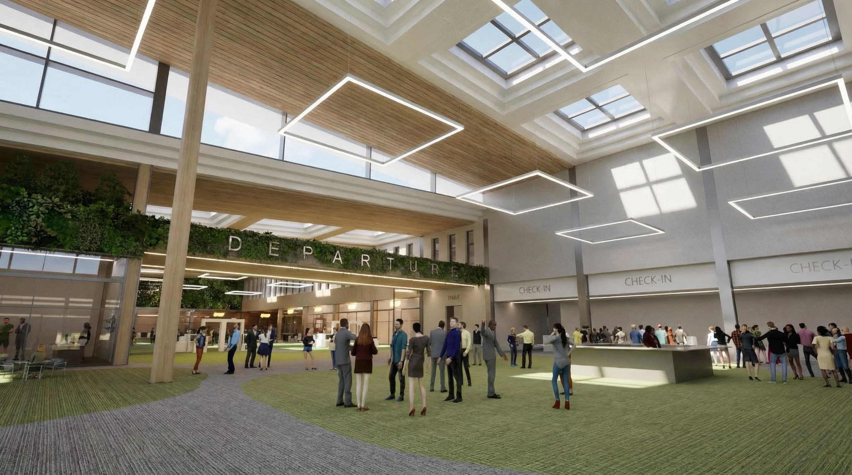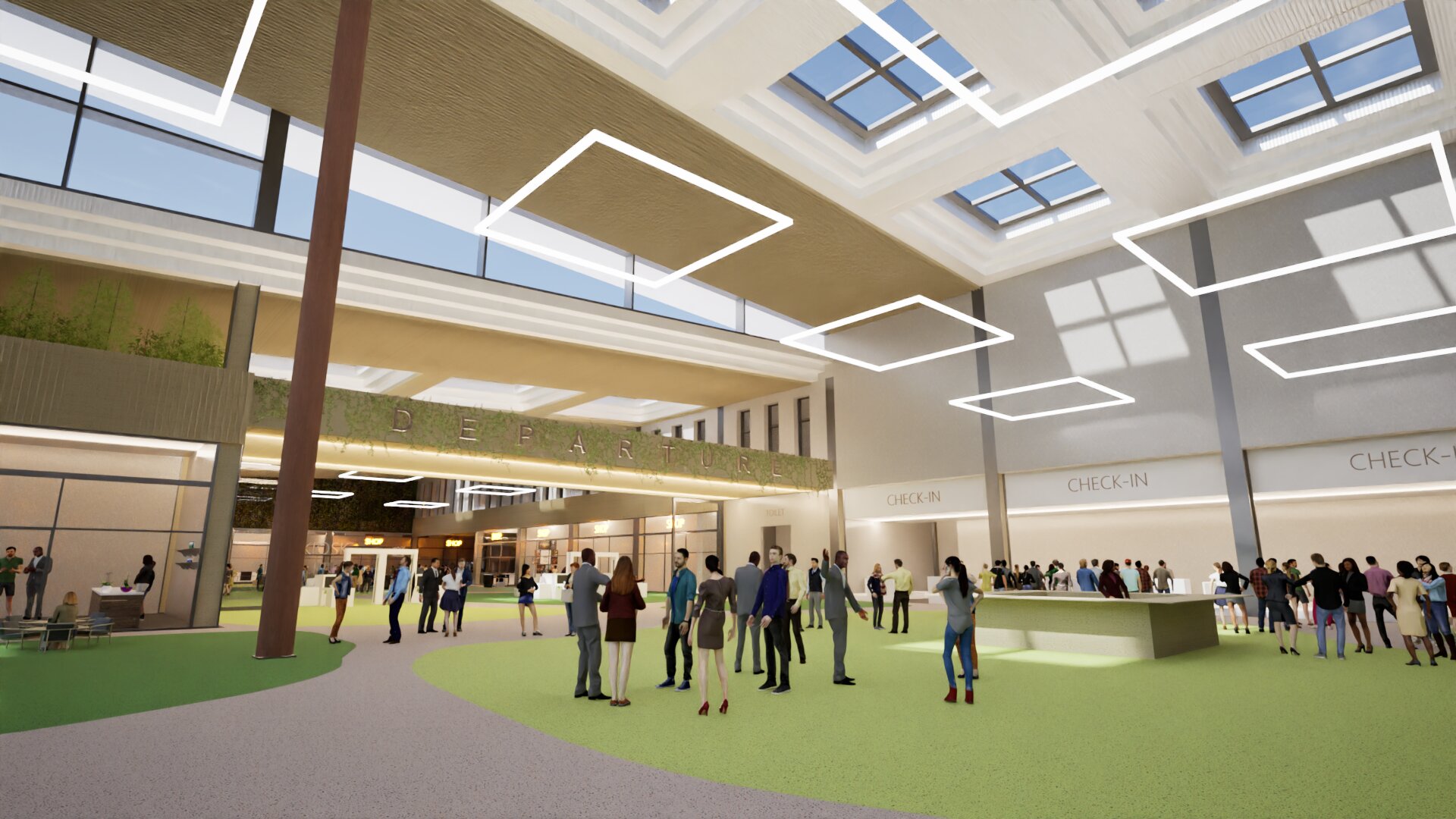 render an expansive modern airport departure hall with a spacious open atmosphere the ceiling is high with large square skylights casting soft natural light the ceiling panels are adorned with elegant white geometric lights the environment is bustling with diverse individuals all dressed in a variety of elegant modern outfits the walls are a soft beige seamlessly blending with the ceiling the check in area to the right displays sleek contemporary desks in light gray with clear minimalistic signage below the floor transitions from a vibrant light green to a neutral gray path harmonizing the space the overall ambiance is lively yet calm illustrating a balance of excitement and order inviting travelers into a world of journey and exploration
