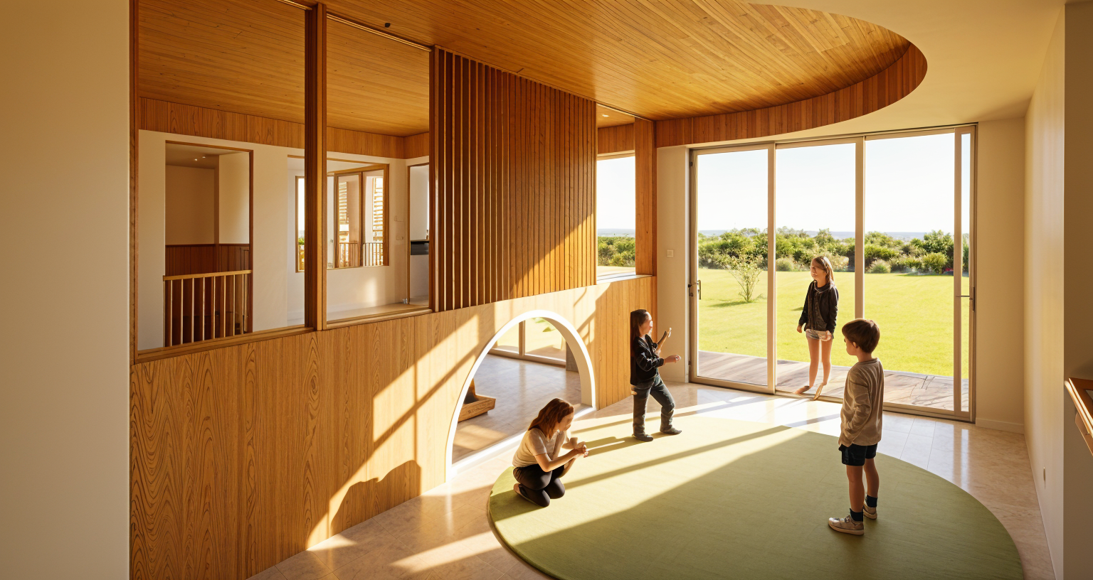 exterior shot the terrace on the left has no ceiling and it has a wall with climbing plants desks and office chairs are on the left and center of the room couches on the right