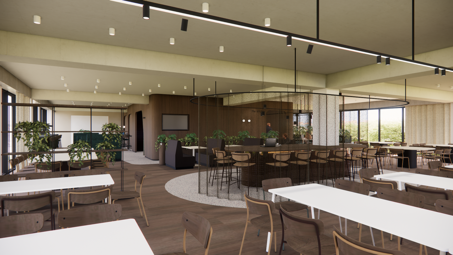 render a beautifully modern office dining area with large windows capturing natural light use a mat wooden floor contrasting with a terrazzo floor light airy atmosphere the ceiling is an acoustical spray on ceiling beige to central curtain is a semi s transparant brown brillant curtain