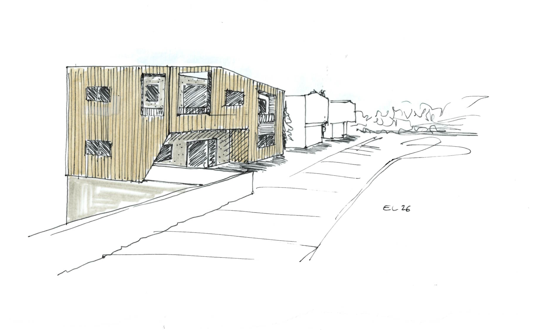 a modern architectural sketch of a building featuring geometric shapes and clean lines the exterior is designed with wooden textures in warm earthy tones like light oak and walnut brown the windows are outlined in a deep charcoal gray providing a striking contrast the concrete foundation has a subtle slate gray hue surround the building with a gentle watercolor inspired landscape in refreshing greens representing trees and foliage the sky is a soft pastel blue with hints of sunlight for an inviting atmosphere