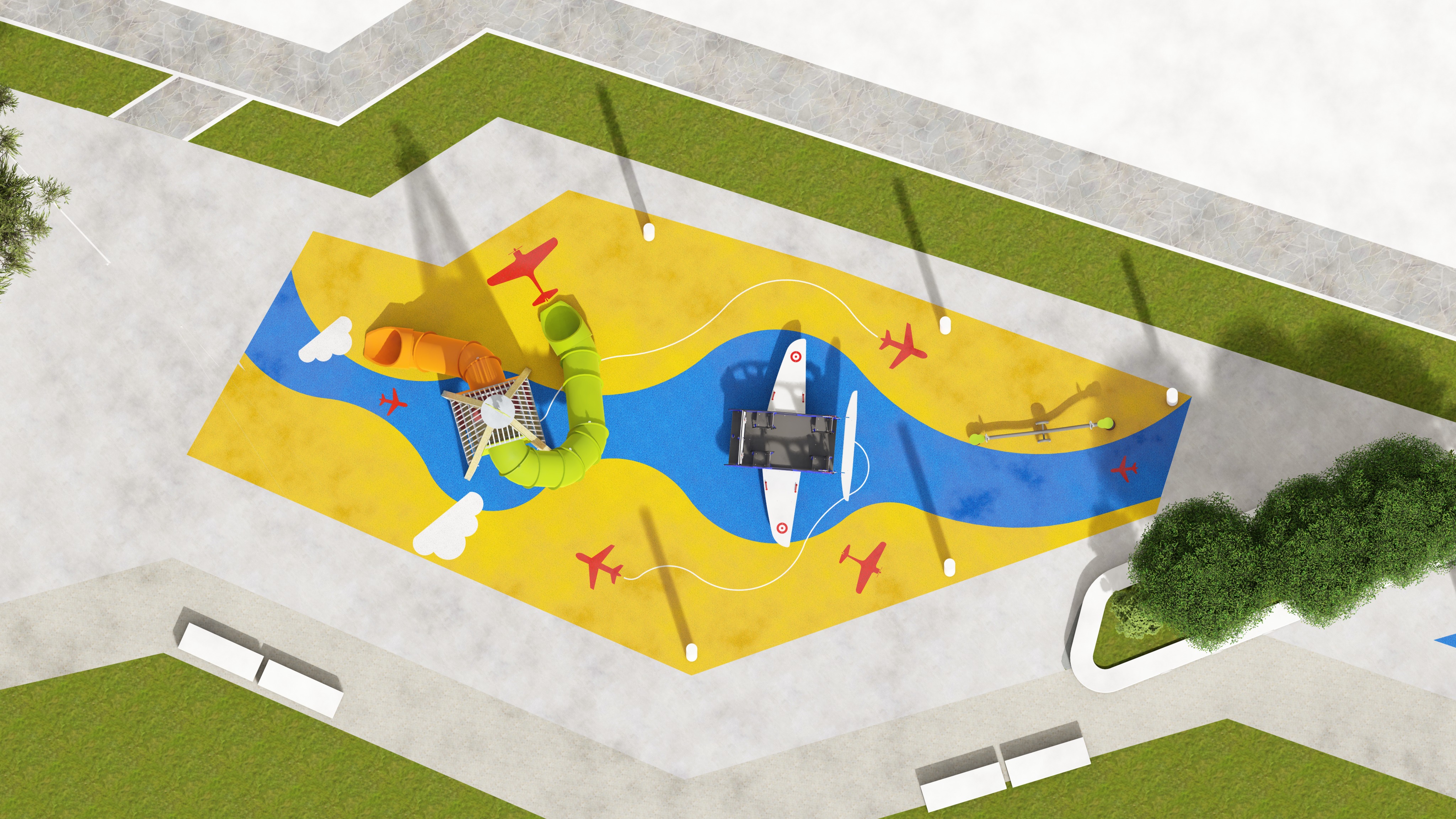 enhance this exact image without changing the original medium blue and yellow color values preserve the exact saturation and hue keep the grass background unchanged add only realistic material texture to the epdm surface subtle rubber grain and micro speckle soft directional shadow from one consistent sun angle gentle ambient occlusion under equipment increased edge sharpness and depth slight surface roughness variation no color grading no tone shift no warm filter no desaturation no cinematic lighting maintain flat orthographic 90 degree top view improve realism without altering colors