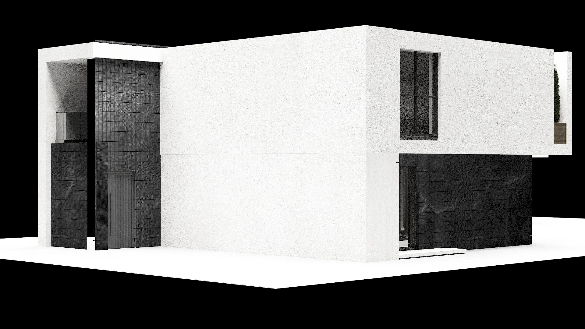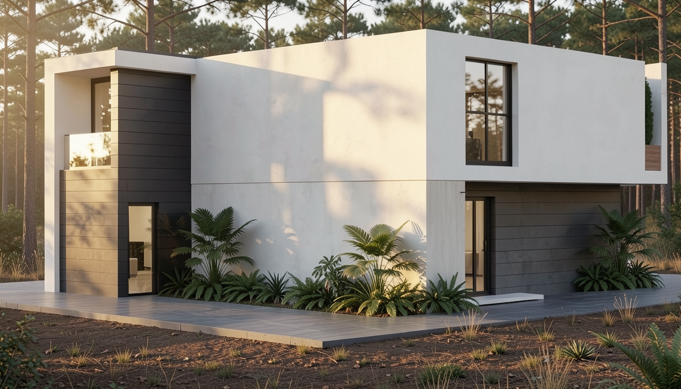 create hyper realistic rendering with exposes concrete in white as well as grey black elements on the facade large glass minimalist windows make plant hyper realistic as well as the grey tilles in the yard golden hour lightening with warm light soft shadows realistic reflections make the background so that the house is located in an isolated wood area do not change any elements in the image do not put new element and do not change colour and material do not add new element or plant do not change house model and do not put new windows