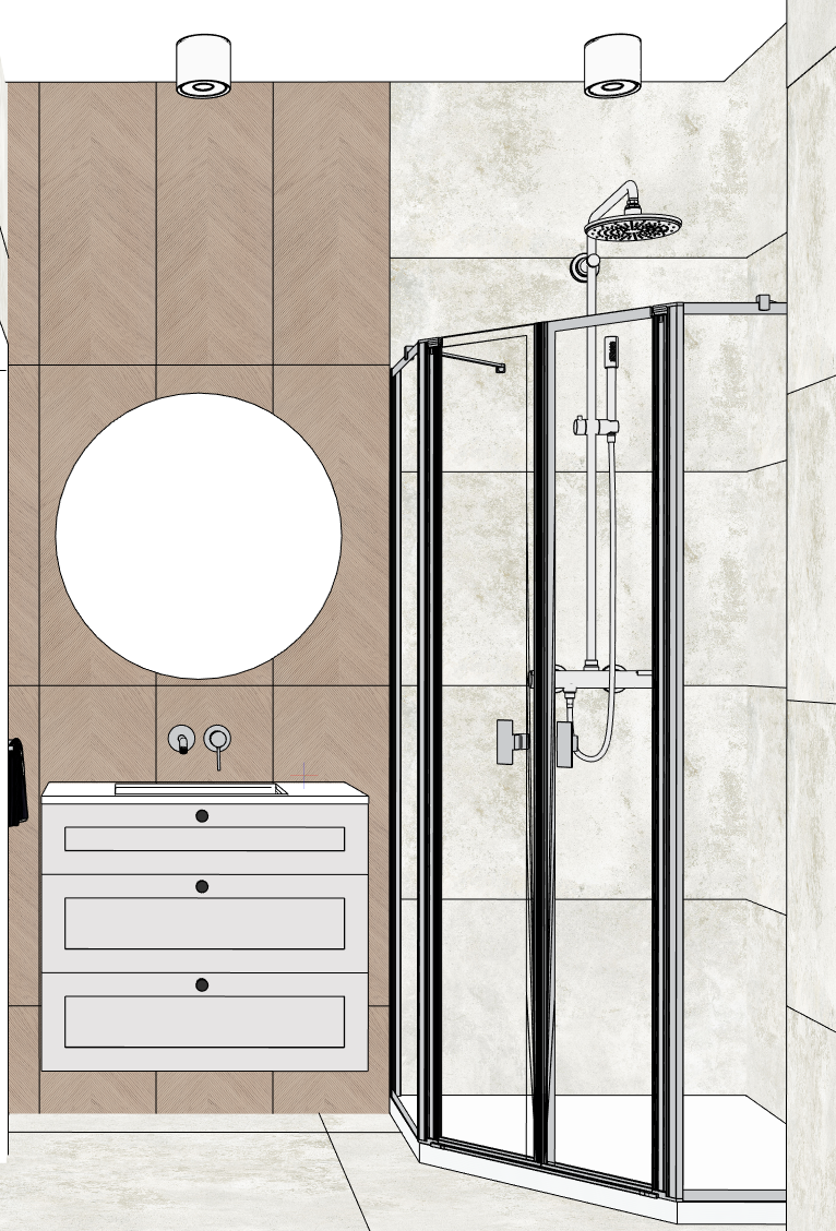 photorealistic modern bathroom interior soft natural lighting realistic materials high detail wall mounted vanity with drawers in light gray matte finish round mirror with backlit led soft glow around mirror indirect lighting effect wall behind vanity finished with warm light wood panels in vertical layout subtle texture walk in corner shower with black metal frame and clear glass doors rainfall shower head large format light beige concrete tiles on shower walls slightly textured light neutral floor tiles matte finish suspended ceiling with built in linear led lighting warm white 3000k led strip integrated in ceiling above vanity and shower forming l shape and extending onto perpendicular wall near shower soft indirect lighting glow from both ceiling and mirror realistic shadows and reflections ceiling spotlights in white cylindrical fixtures clean minimalistic contemporary design ultra realistic render 4k global illumination ray tracing depth of field modern bathroom with layered lighting design backlit round mirror with soft halo glow warm white led indirect led lighting in suspended ceiling continuous strip forming l shape across ceiling and wall soft ambient lighting realistic light bounce on wood and concrete textures cinematic interior lighting photorealistic illumination