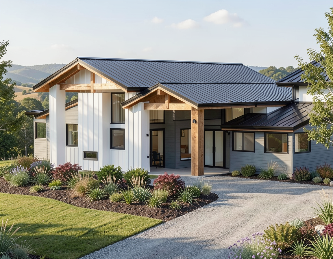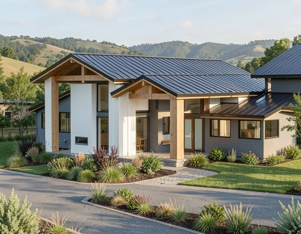 place a dark brown deck outside the window with modern outdoor furniture