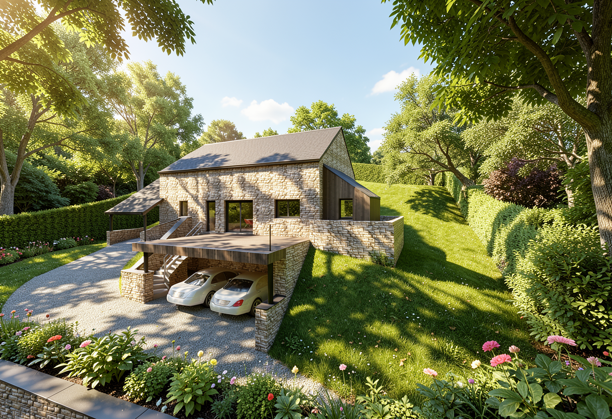 fai una pensilina con struttura in legno massello color noce e puntoni di legno contro il muro della casa la pensilina va posizionata 30 cm sopra la porta centrale la porta con la tenda e inserita tra le finestre senza coprirle e sporge 2 metri verso chi guarda