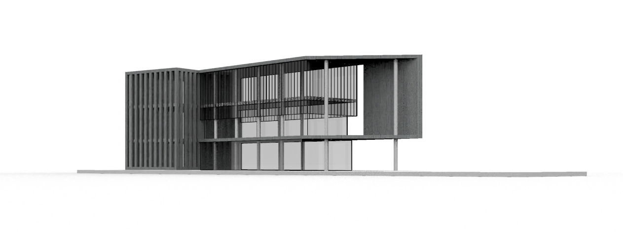 brutalism exterior shot keep the original view and do not add lanscape no color on the surfaces just true material as cast concrete reflected glass on facade and metallic black vertical elements architecture