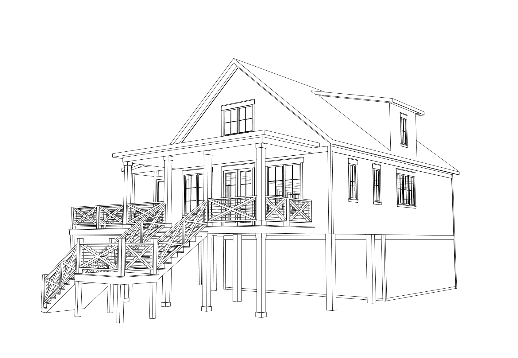 beach house on stilt foundation make realistic light metal roof board and batt siding left porch is screened in white posts and steps