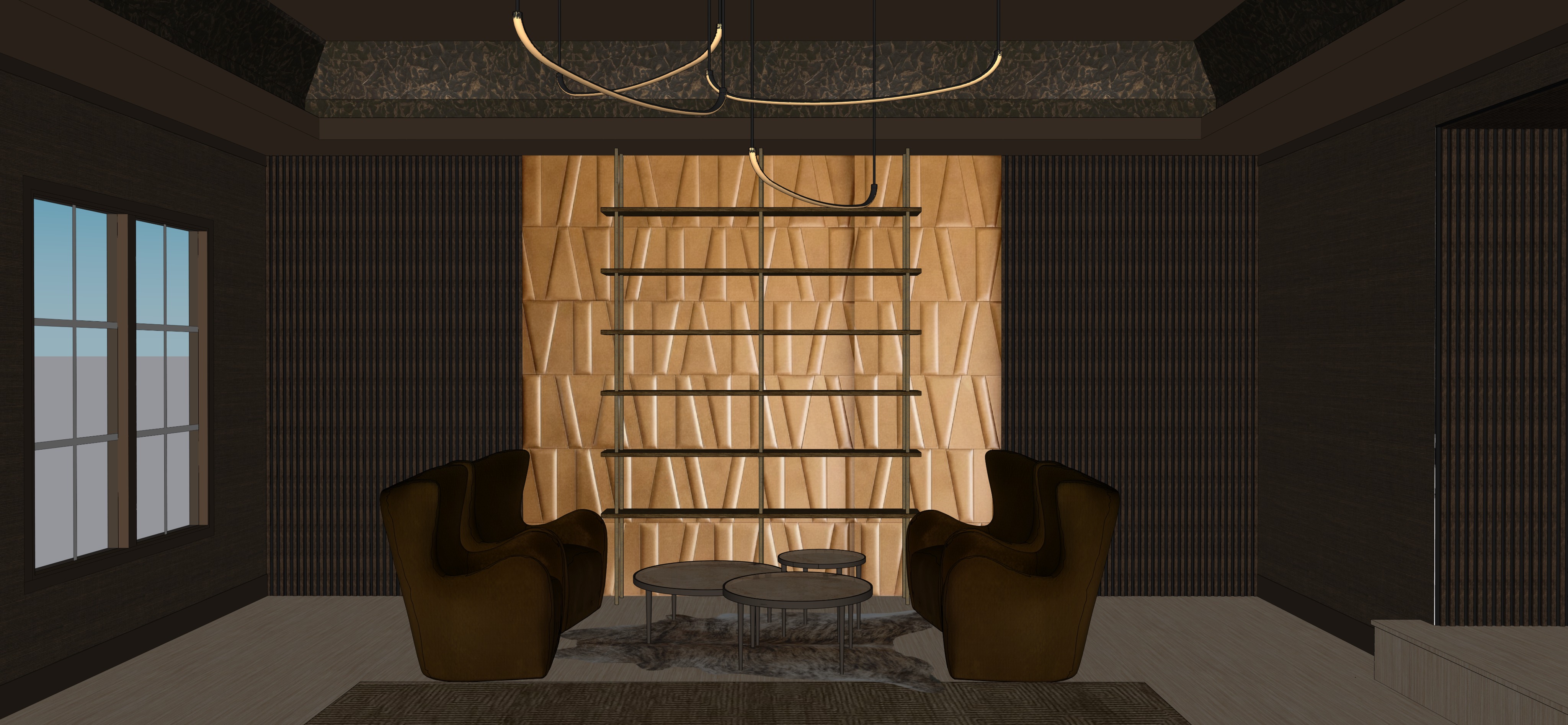 interior lighting should be primarily ambient and artificial with a low contrast moody atmosphere the room is lit mainly by warm integrated ceiling lighting and decorative pendant fixtures providing soft even illumination across the space light levels should feel controlled and intentional with no strong directional daylight the window on the left should emit minimal diffused daylight only acting as a secondary fill light window light should be soft indirect and low intensity with no visible sun beams no hard shadows and no bright highlights on the floor or walls the window should not function as the primary light source overall exposure should be balanced toward interior lighting emphasizing warm tones subtle shadow depth and a calm intimate ambiance avoid overexposure near the window and prevent the window from washing out the interior materials