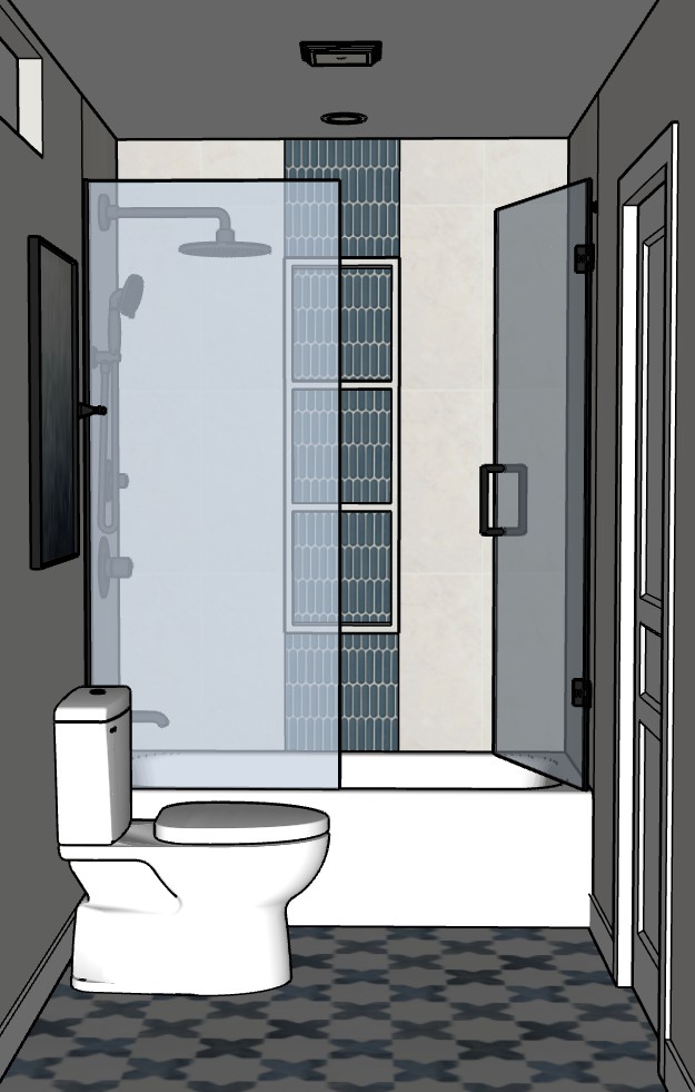 make this photorealistic use natural light and soft shadows wall paint color is calm by benjamin moore with is a light greige color flooring is white and blue repeat pattern the blue is shaped like an x all hardware are matte black shower walls are boscato cream white 12x24 stacked vertically the small window near the ceiling does not have any casing and will only show soft light shower glass with a hinge door and black hardware artwork over toilet is textured and a gradient white to blue in a thin black frame do not add towel rings or bars the far shower wall has a 13 accent strip in vienna fingers night sky by tile shop with 3 niches centered in the strip and framed in the countertop material