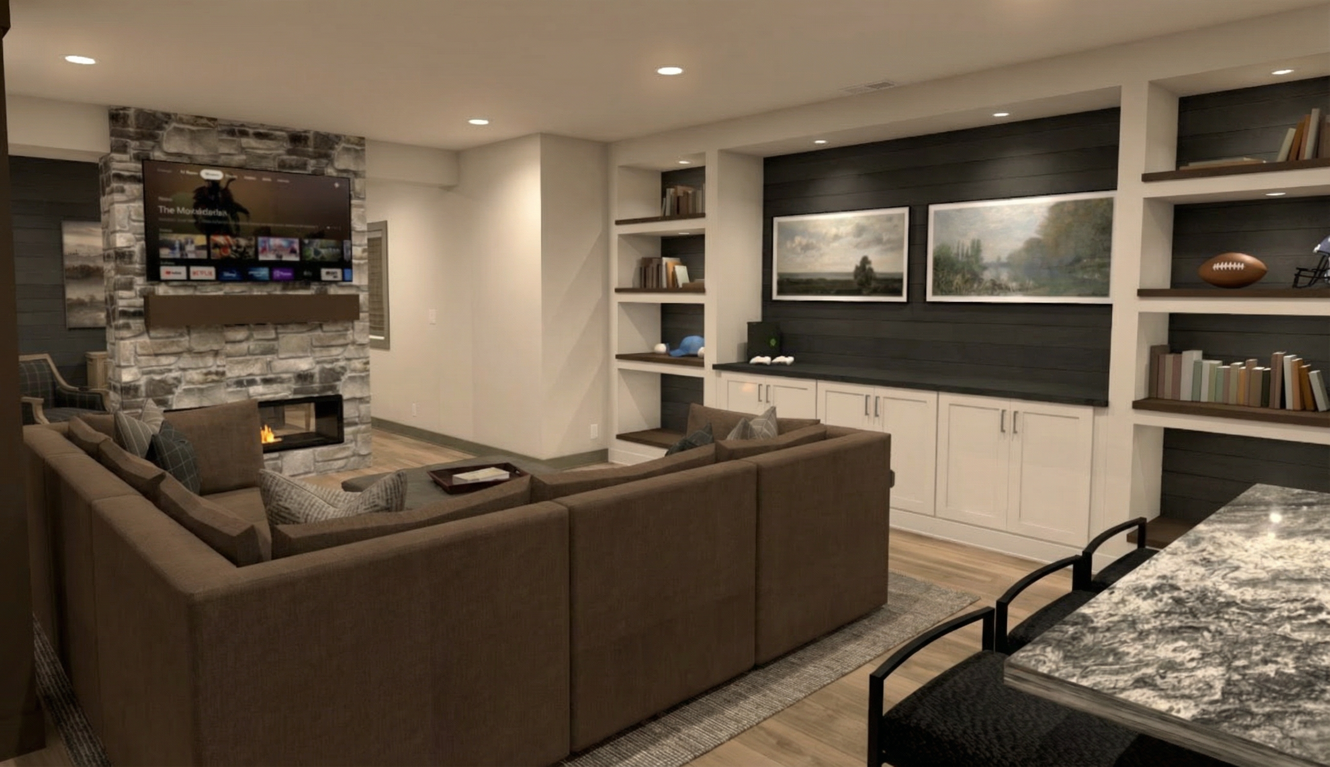 use exactly the same geometry layout and camera angle from the reference image do not alter add or invent any element do not move resize or reinterpret any cabinet shelf drawer or structural element only apply material changes all built in cabinets doors drawers and shelves in oxford white satin finish flooring in white oak texture porcelain tile geometry is locked flat panels for all drawers no shaker style