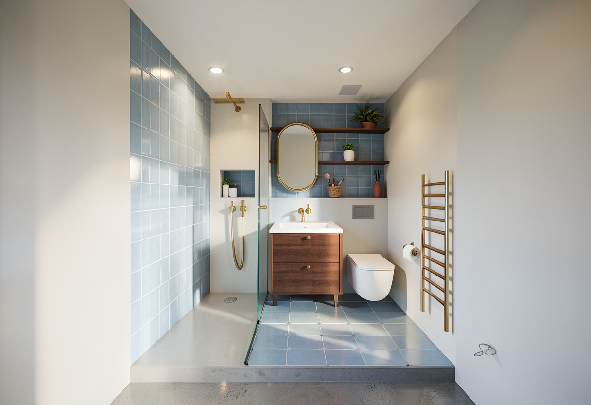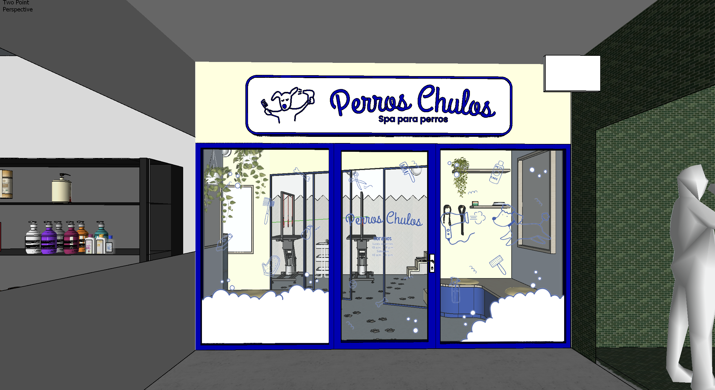 hyper realistic exterior render of a dog grooming and bathing store located inside a modern shopping mall corridor front view of the storefront the facade is composed of floor to ceiling clear glass panels with royal blue metal frames and mullions clean and glossy with realistic reflections and transparency through the glass the interior is visible illuminated with neutral white artificial lighting 4000k showing grooming stations hanging plants and the reception area in the background above the storefront a backlit lightbox sign with a white background and royal blue vinyl graphics the sign reads perros chulos spa para perros friendly modern typography crisp edges evenly illuminated no overexposure the shopping mall corridor features other commercial storefronts on both sides with neutral finishes display shelves and subtle storefront lighting mall floor in smooth gray concrete or polished surface clean and well maintained ceiling and walls of the mall are modern and minimal with soft ambient artificial lighting no natural daylight realistic materials accurate scale soft shadows global illumination reflections on glass professional architectural photography style straight on camera angle eye level view ultra high resolution 4k hyper realistic render