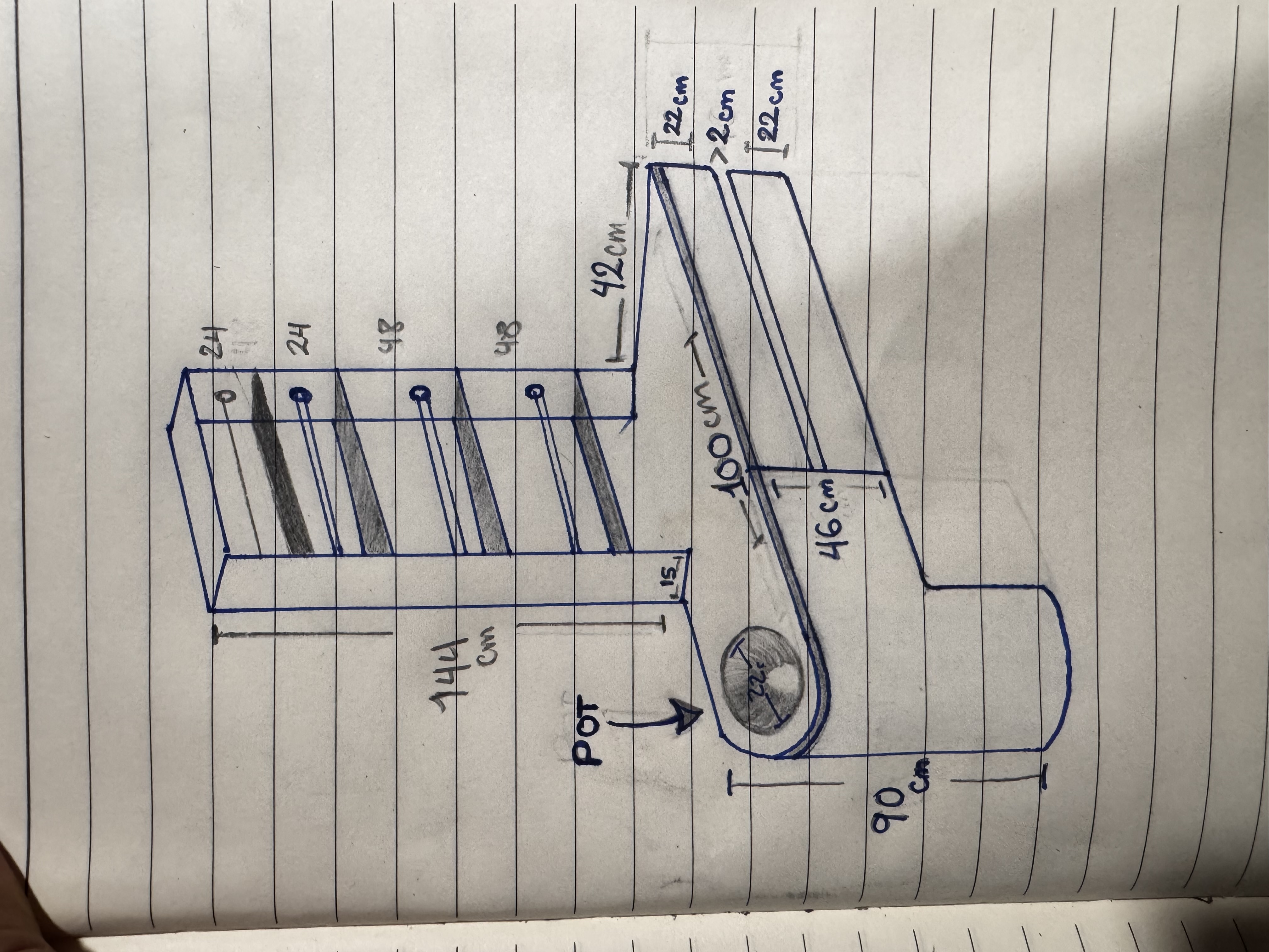 create a 3d model of a modern furniture or hydroponic style structure based on the following specifications and dimensions keep the same proportions layout and clean aesthetic as shown in the hand drawn design structure overview the model consists of two main parts a tall vertical section with multiple horizontal trays or shelves a horizontal arm extending from a cylindrical base that includes a circular pot or basin on top dimensions and details vertical section total height 144 cm width side to side 42 cm depth 15 cm contains 4 shelves top two shelves spaced 24 cm apart bottom two shelves spaced 48 cm apart each shelf is angled slightly downward as in the drawing and enclosed on both sides maintain the boxed rectangular frame aesthetic horizontal arm extends 100 cm horizontally from the vertical section height of arm from base 90 cm the arm thickness vertical height of rectangular beam 46 cm width front to back 22 cm the top surface of the arm connects seamlessly to the vertical section and supports a circular pot on its left end circular pot section diameter of circular pot opening 22 cm located at the top left corner of the arm the pot is recessed into the top surface cylindrical base below this section extends down 90 cm from the top surface other measurements small gap of 2 cm is visible between upper and lower plates in the horizontal arm side overhang from vertical to horizontal joint 12 cm aesthetic style clean modern slightly industrial look smooth edges sharp corners and minimalistic design keep proportions and arrangement exactly as drawn in the reference image use neutral materials warm wood and micro cement for the left side no additional decorative elements architecture