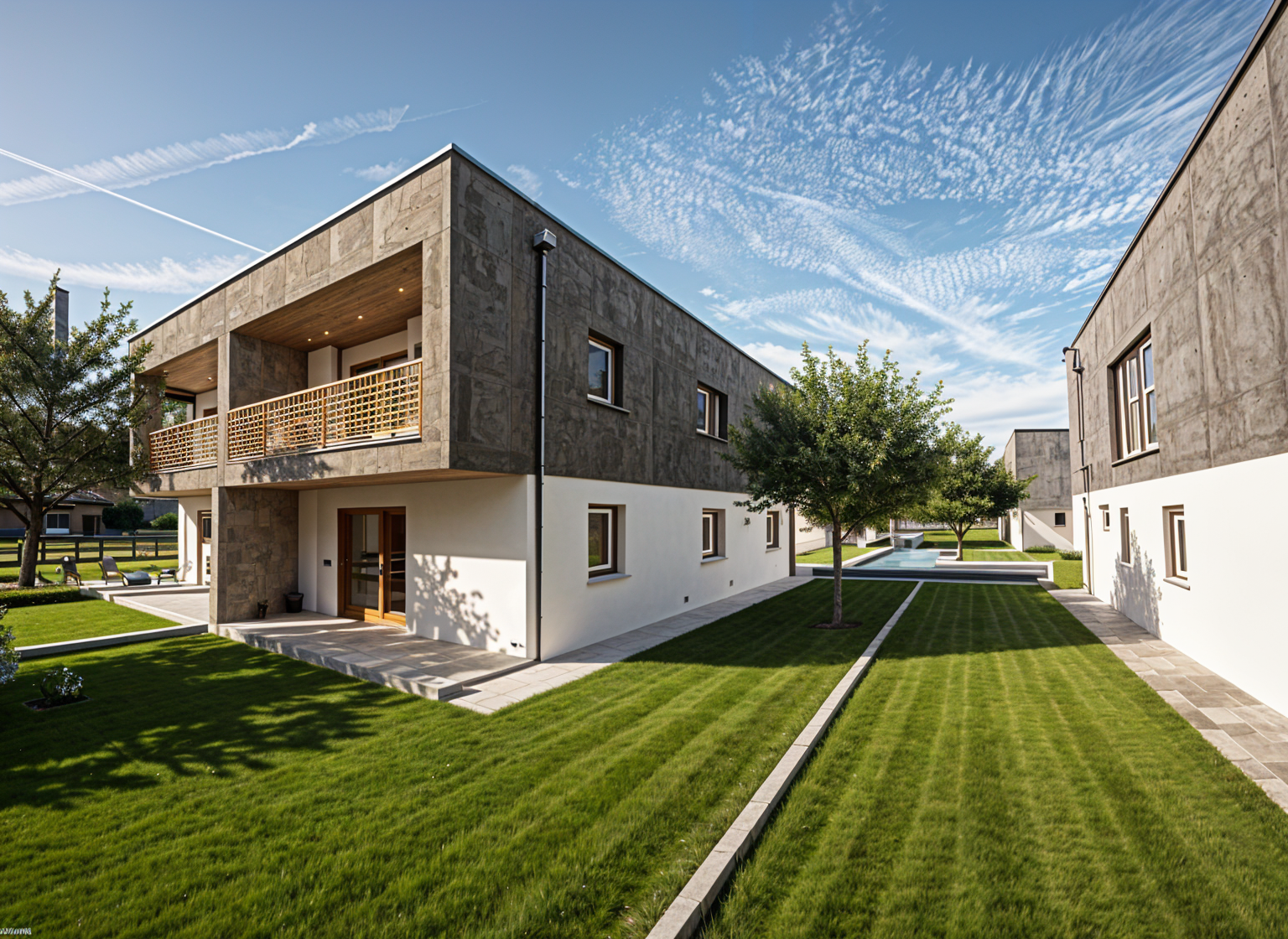 transform this rendering into a warm winter scene add fresh soft snowfall on the rooflines landscape and hard surfaces introduce warm ambient lighting that creates a cozy inviting glow from the windows and subtle golden highlights on exterior materials include gentle snow accumulation on railings ledges and vegetation with light flakes falling in the air maintain all architectural details and proportions while enhancing the overall atmosphere to feel like a serene warm winter day add christmas lighting