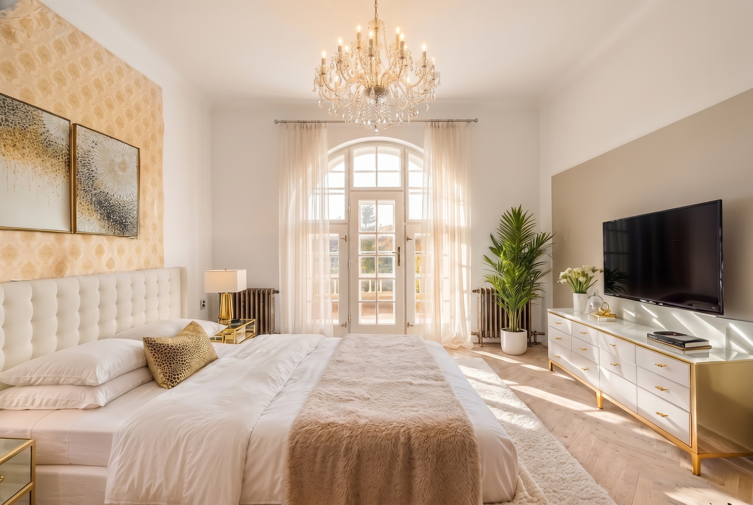 vykresli nov tapety se zlatav m motivem po obou stan ch m stnosti za postel i za tv do stejn v ky radi tory vykresli jako nov modern hladk b l