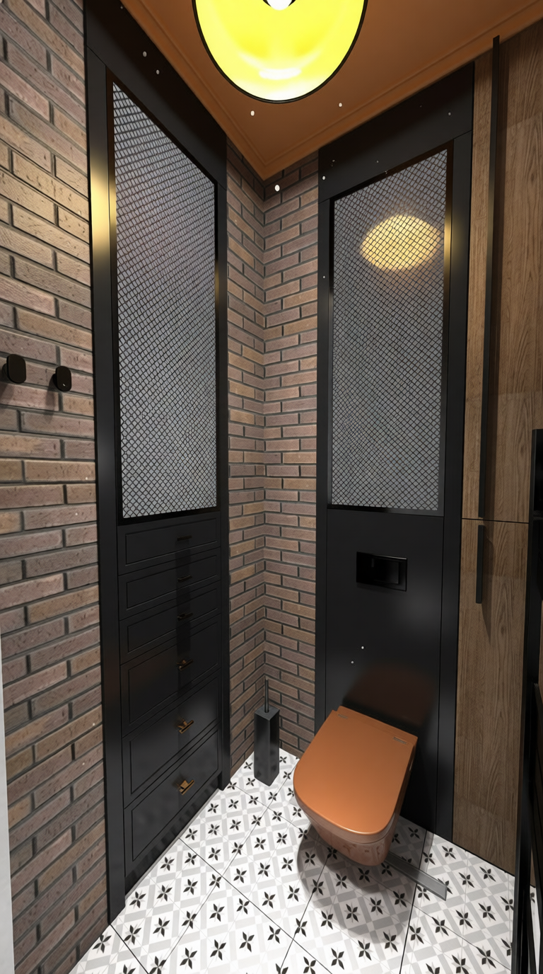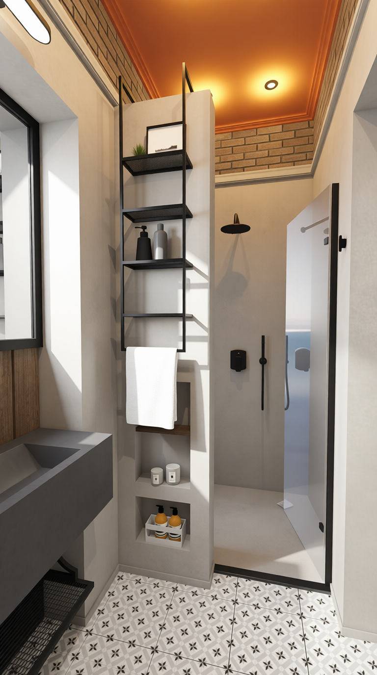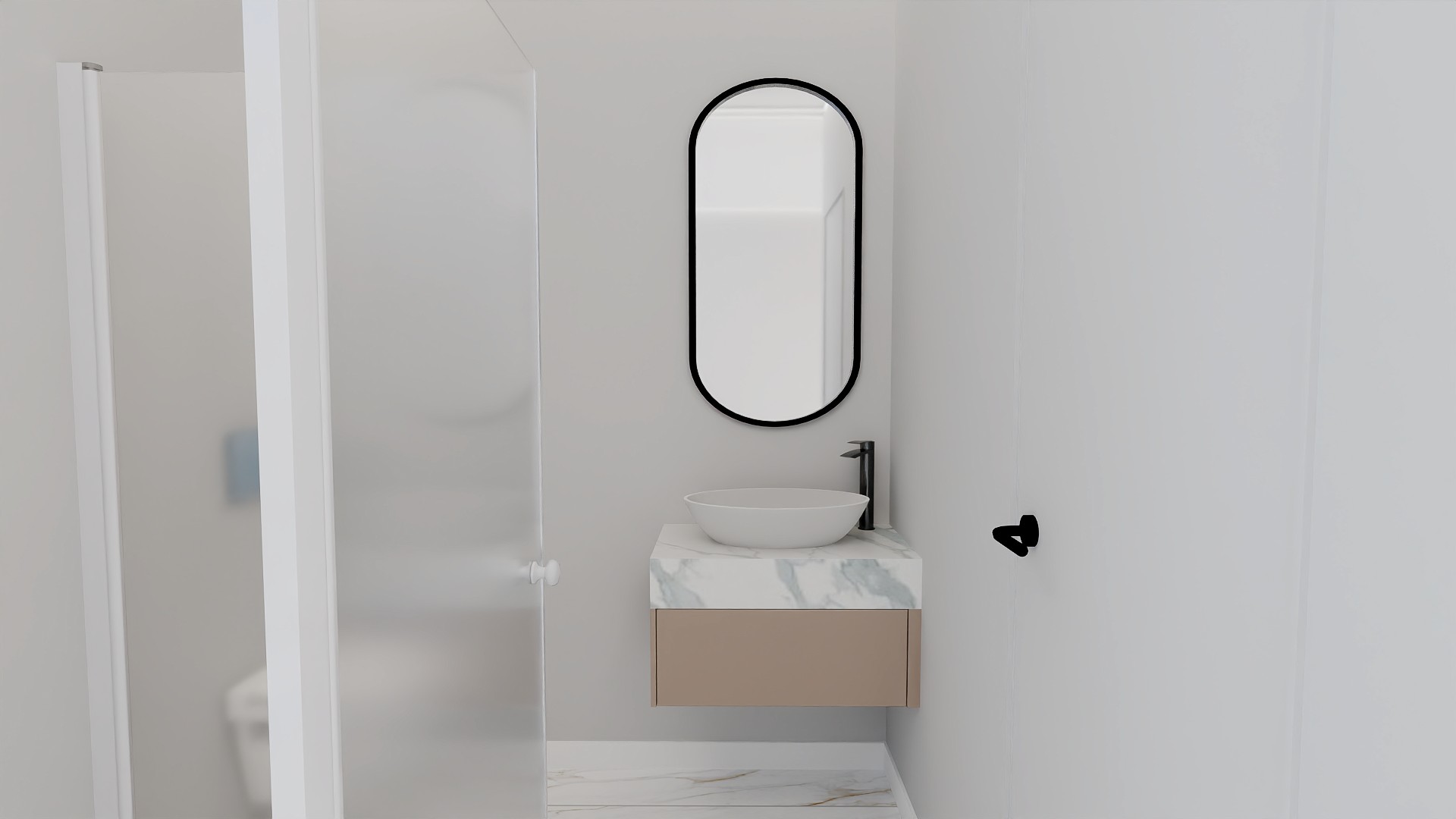 remove the black frame from behind the mirror only make all the walls the same colour as the floor tile add led light behind the mirror