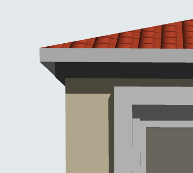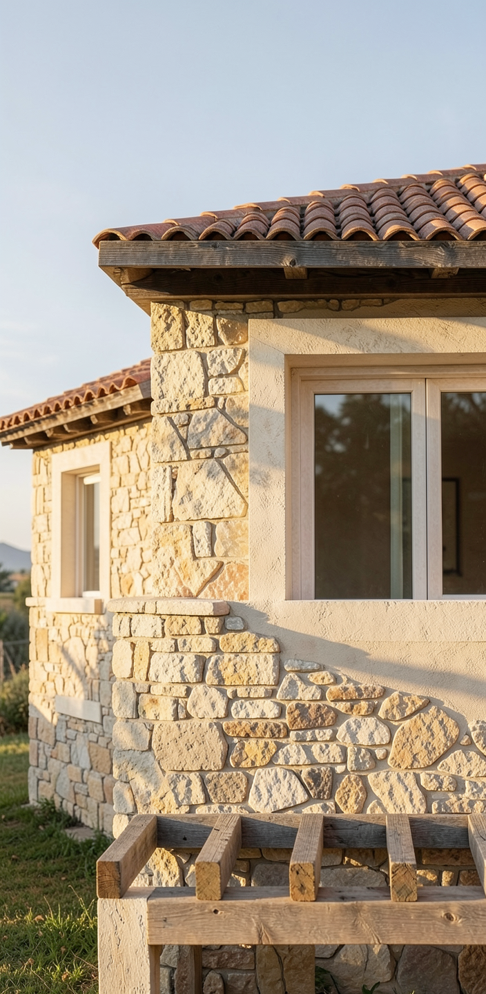roof detail of stone house natural stone wall clay roof tiles visible eaves realistic materials architectural detail photorealistic