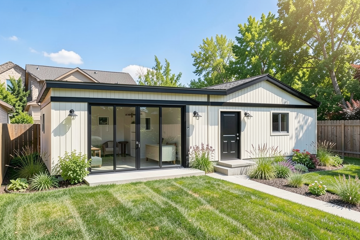 the couch is black leather the rug is green and has a nice texture the walls on both side are container and the kitchen is green