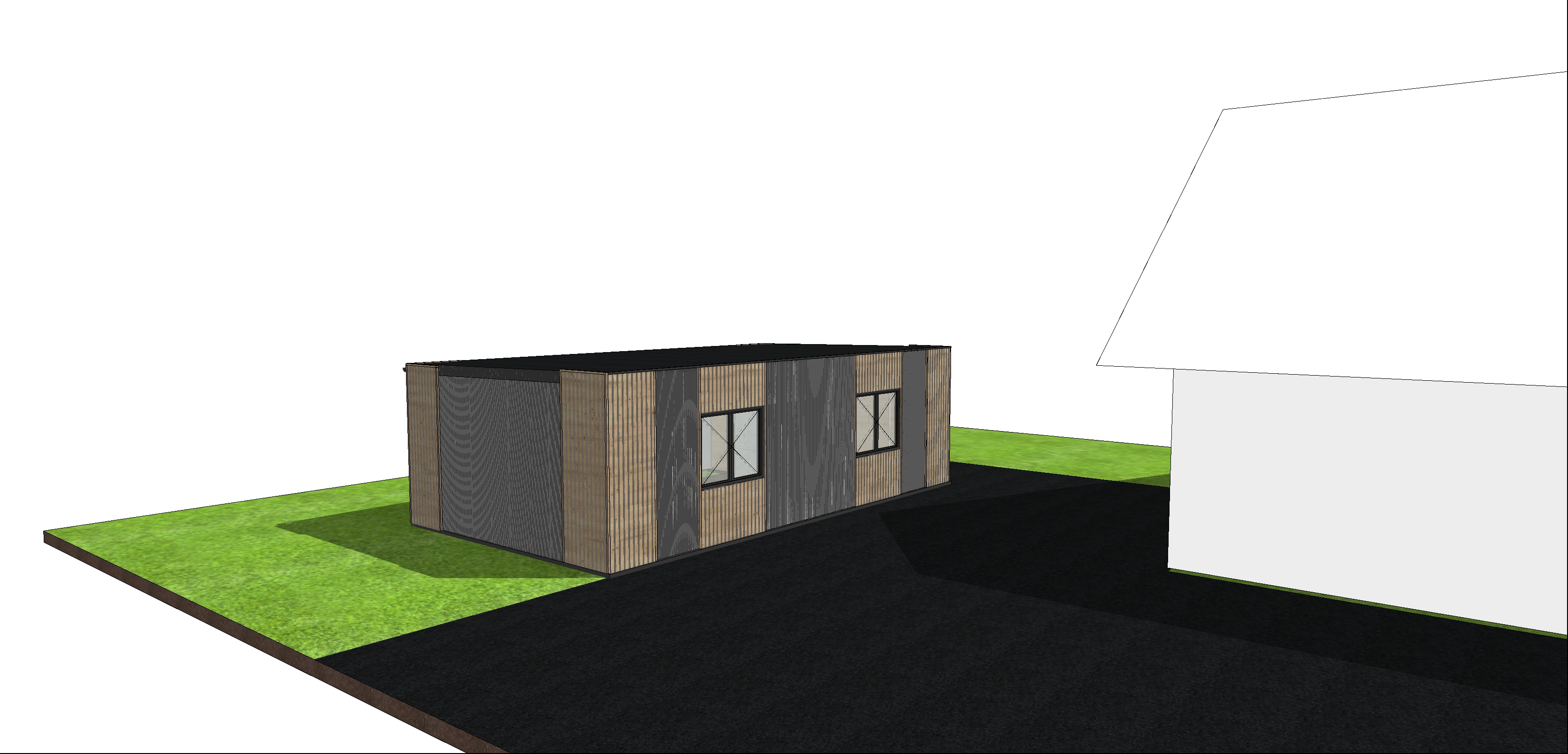steel pavilon with wooden lamels elements on elevation and the white building natural daylight