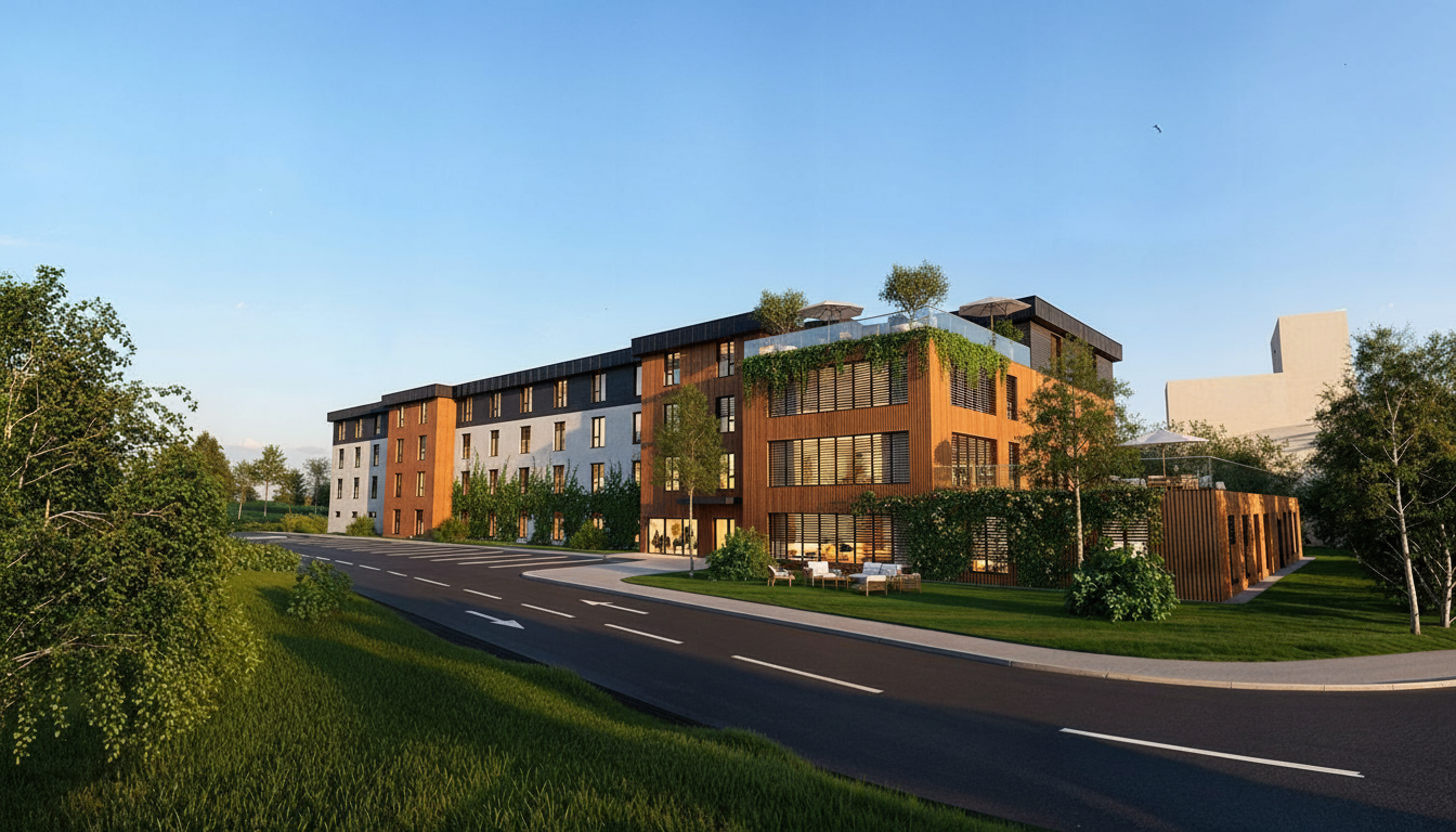 nicholas grimshaw exterior shot put ethimo furniture on terraces addd outer jalousie on every window put vegetation on terraces change wooden parts of facade to larch planks partly with ivy on it architecture