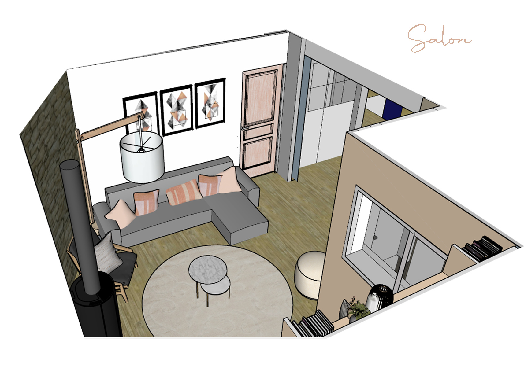 canap couleur ros avec coussins parquet en bois tapis beige cadres assortis au mur