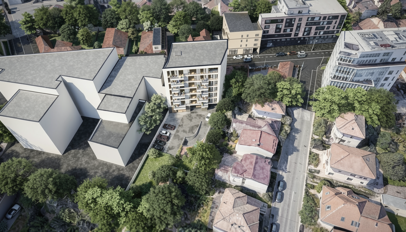 important preserve the existing geometry and the existing context exactly as provided do not modify alter reinterpret add remove scale or reshape any geometry do not change the site surroundings street layout neighboring buildings vegetation or context elements do not modify geometry scale proportions buildings road layout sidewalks or surrounding context in any way do not change text photorealistic architectural rendering clean and balanced contrast calm cinematic mood style contemporary european residential architecture minimalist premium understated soft overcast noon atmosphere diffused cold natural daylight with subtle blue grey tones cinematic architectural mood warm interior lighting 3000k glowing from inside creating strong contrast between cool exterior and warm interior large glass surfaces with realistic reflections soft mirror effect subtle environmental reflections of sky and surroundings gentle fog diffusion in background high dynamic range lighting realistic global illumination soft shadows calm and minimalist nordic mood photorealistic architectural visualization balanced exposure no harsh highlights delete all people car with light on and motion blur people inside building