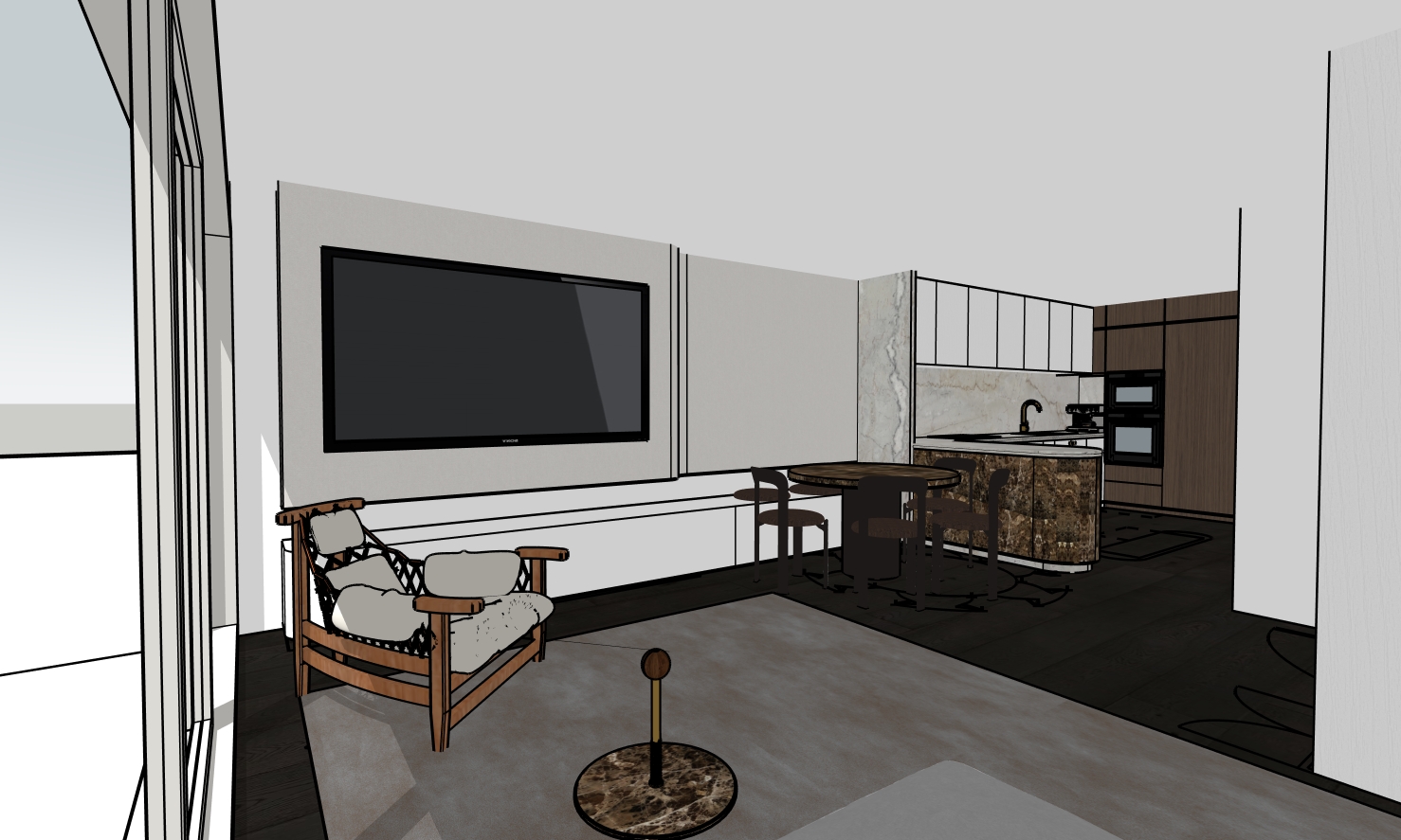 austral dream dolomite on benchtop brown dark emperor marble dining table rey chair umber brown brown japanese black timber floor polytec bianco woodmatt cabinets black mirroed vzug ovens on mohogany wallnut timber cabinetry tower lo co almond knob oil rubbed bronze warm tone rub jangada armchair in off white leather tv curved wall to kictchen in limewash warm tone on a warm winter morning light in sydney an apartment facing north with sheer curtains