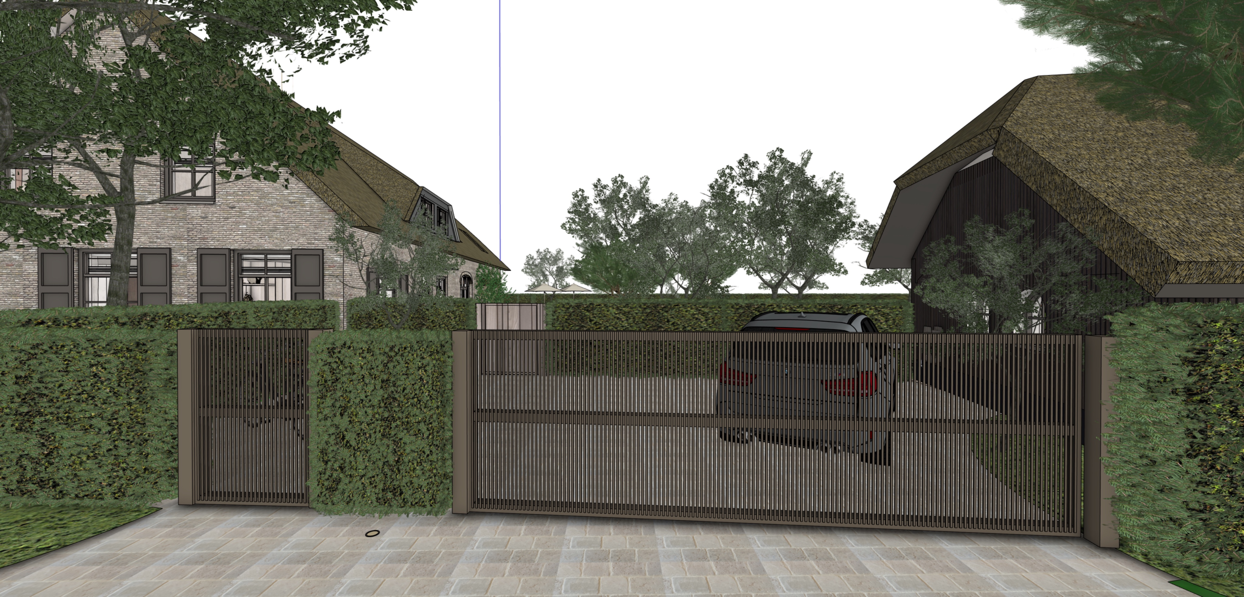 de poort mag van hout zijn de twee getoogde raampjes mogen in het kleine gebouw