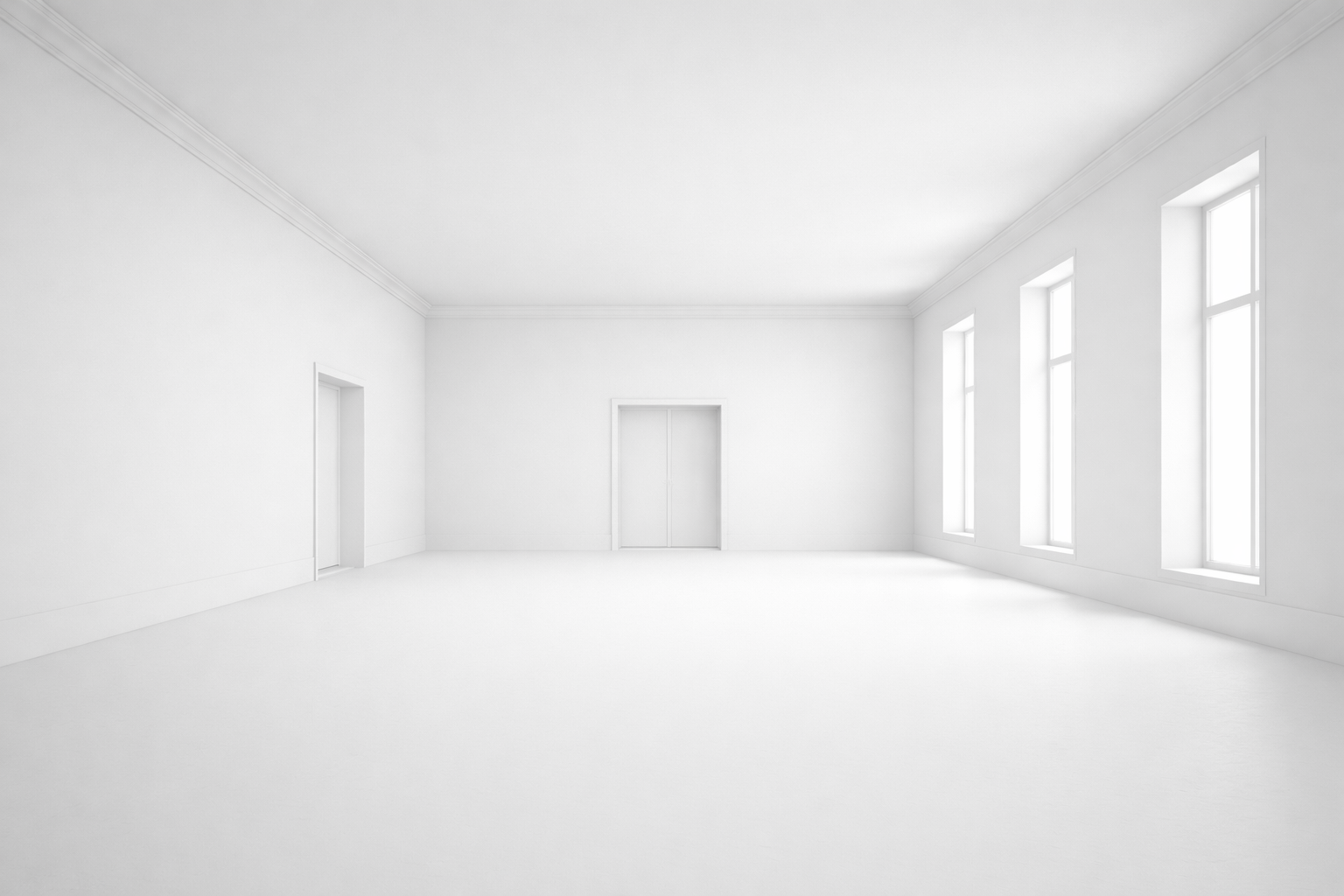 take the existing white model of the rectangular conference room 16 00 m 12 15 m 4 00 m and renovate it into a grand cinematic classical modern auditorium style conference room preserve all walls ceiling floor windows and proportions exactly on the left wall add only three single doors flush geometrically aligned and finished in glossy black lacquered wood apply the full design language we have developed walls and moldings in cream and ivory with all paneling and cornices matching the wall or ceiling color no gold strictly geometric linear and rectilinear with clean classical proportions and hierarchy ceiling high coffered ceiling with restrained geometric classical details same color as the ceiling no gold flooring luxury carpet inspired by the original marble geometry featuring diagonal lines and rectangular intersections layered patterning with a slightly richer runner along the main aisle and subtly denser zones under the chairs all in the restricted color palette of cream ivory black and burgundy creating visual depth and a full refined atmosphere furniture layout arrange rows of ultra luxurious chairs facing the back wall proportional and dense enough to fill the space while preserving circulation on a slightly raised platform at the back place a long rectangular table in dark polished wood with subtle brass detailing and include a flush geometric projection wall behind it furniture should feel modernized old money luxury restrained elegant richly upholstered with clean geometric lines no office chairs plastic or low end furnishings windows preserve all original windows exactly do not add drapes or curtains lighting props do not add lighting fixtures decorative objects vases artwork or props richness and atmosphere come solely from materials carpet and furniture rendering perspective ultra photorealistic 24mm wide angle architectural rendering corrected perspective straightened verticals and horizontals precise geometry emphasizing depth layered textures and luxurious material richness overall goal create a dense luxurious cinematic classical modern auditorium style conference room with geometric carpet refined cream and ivory wall and ceiling paneling coffered ceiling rows of ultra luxurious chairs a long stage table with projection wall and three glossy black lacquered doors on the left wall only using only the restricted color palette of cream ivory black and burgundy fully consistent with old money luxury style and perfectly proportional
