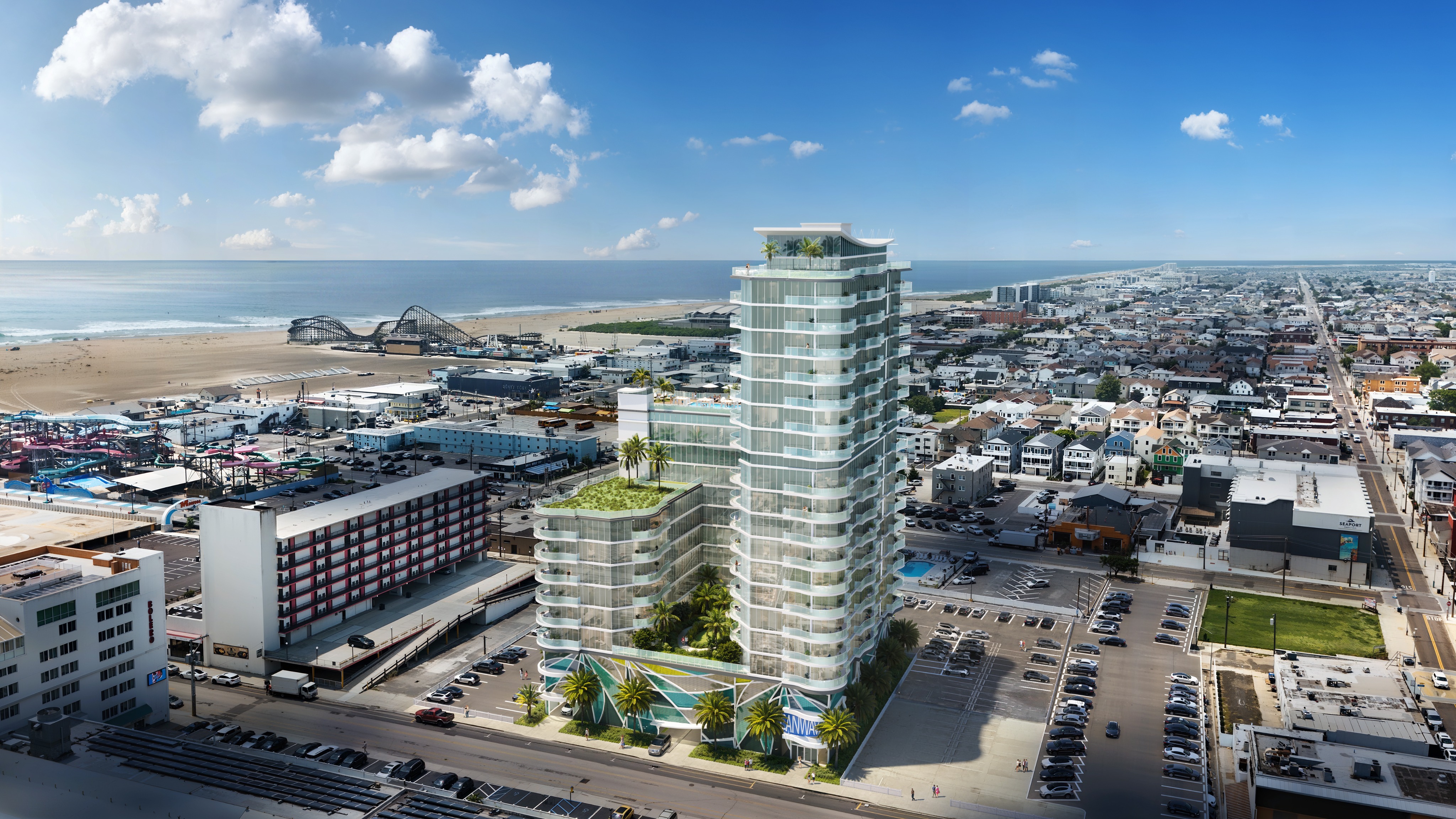 update rendering style impressionistic architectural sketch fast pencil strokes watercolor blend dreamy and artistic keep colors as shown do not change primary high rise but soften the surrounding context so it becomes less clear make site context black and white add sketchy line style but remove water color aspect of filter remove site context to show vignette of proposed highrise