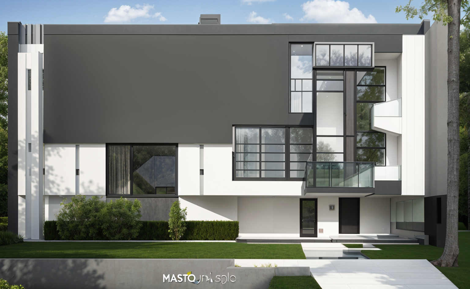 modern exterior shot a modern two story retail building with elegant architectural detailing exterior walls painted in a soft ivory color complemented by charcoal gray accents large glass windows reflecting a bright blue sky roof trim and awnings in brushed steel sidewalks in light gray with lush greenery surrounding the building atmosphere vibrant and inviting a sunny day with soft shadows architecture