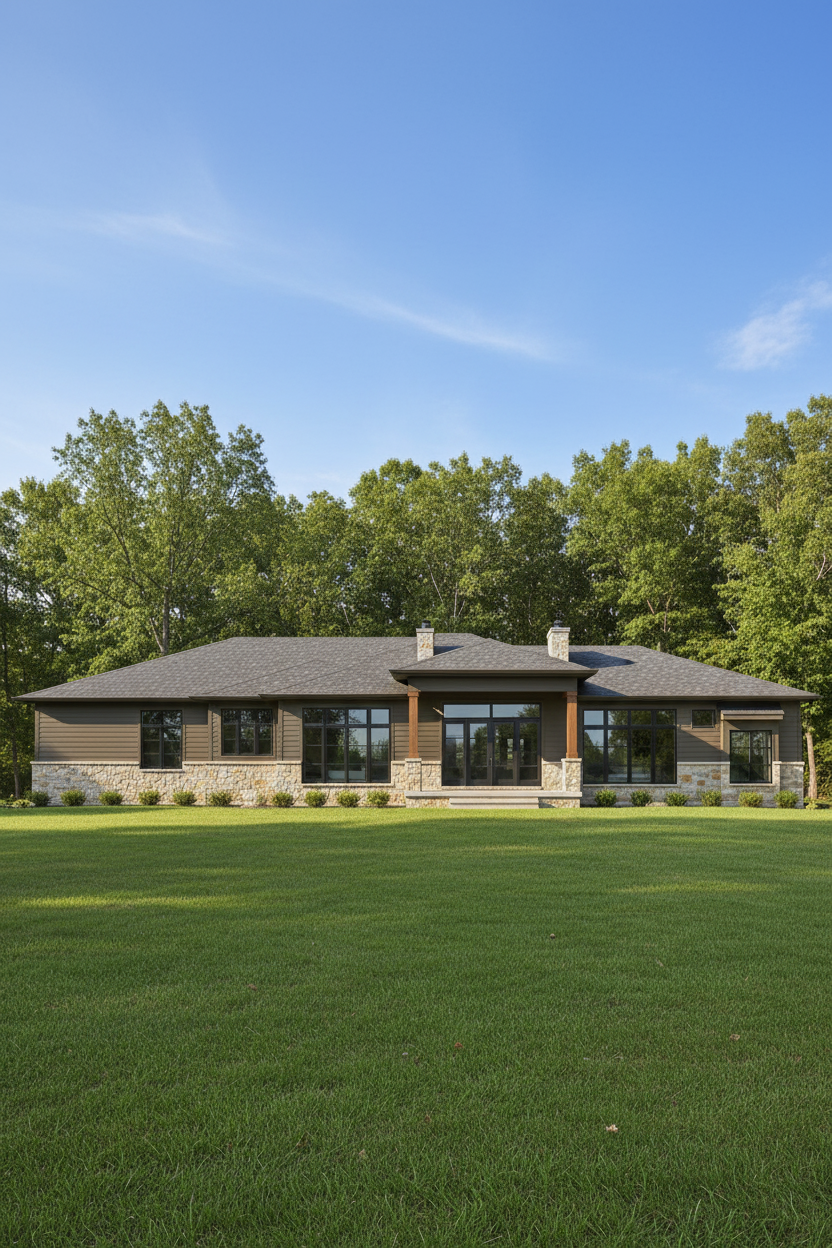 blurry brushed watercolor rendering of modern house with black and medium tone warm wood siding surrounded by oak tree forest and leafy forrest floor architecture