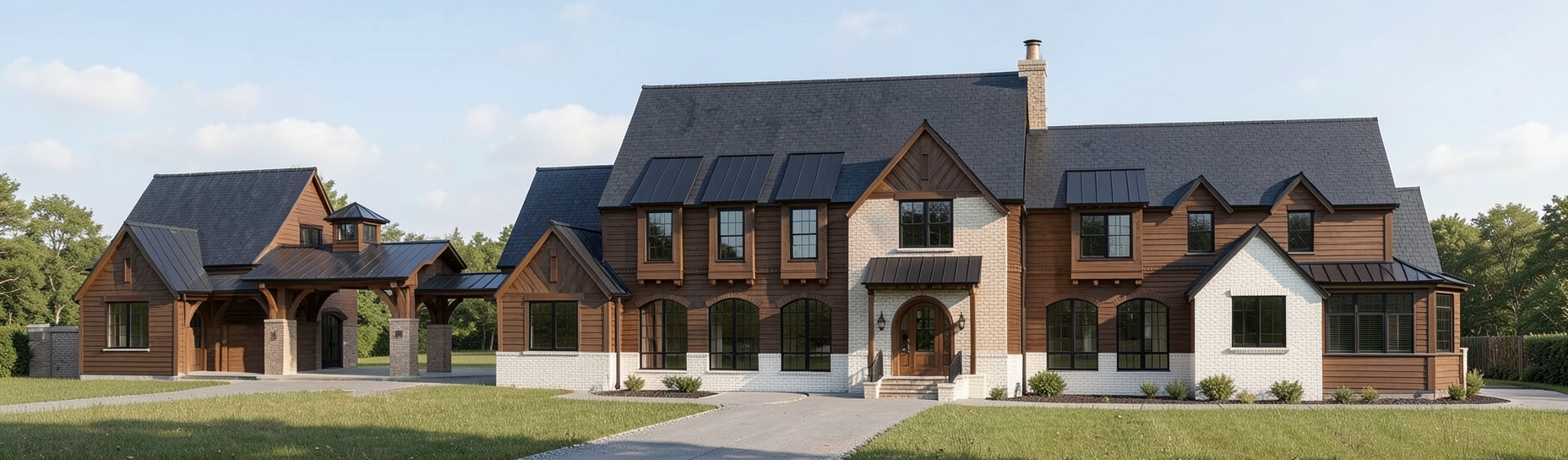 white lap siding throughout with black board and batton roof peaks black roof in forest with a side loaded driveway