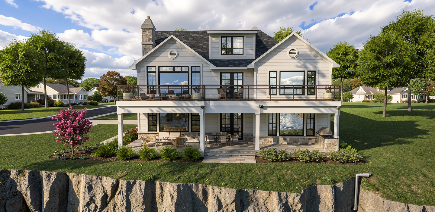you are a professional image renderer you create the highest grade renderings around and specialize in architectural renderings this is the front elevation of a home create a high resolution photorealistic image of this structure keep the windows as they are where they are keep the doors as they are where they are keep the main structure as it is where it is feel free to change the perspective keep the roofline as it is where is it do not add anything to the structure that i have not asked for the background is east texas it should be early afternoon with a bright sunny day clear skies the landscaping should be late summer with plenty of color and should be that of a professional gardener