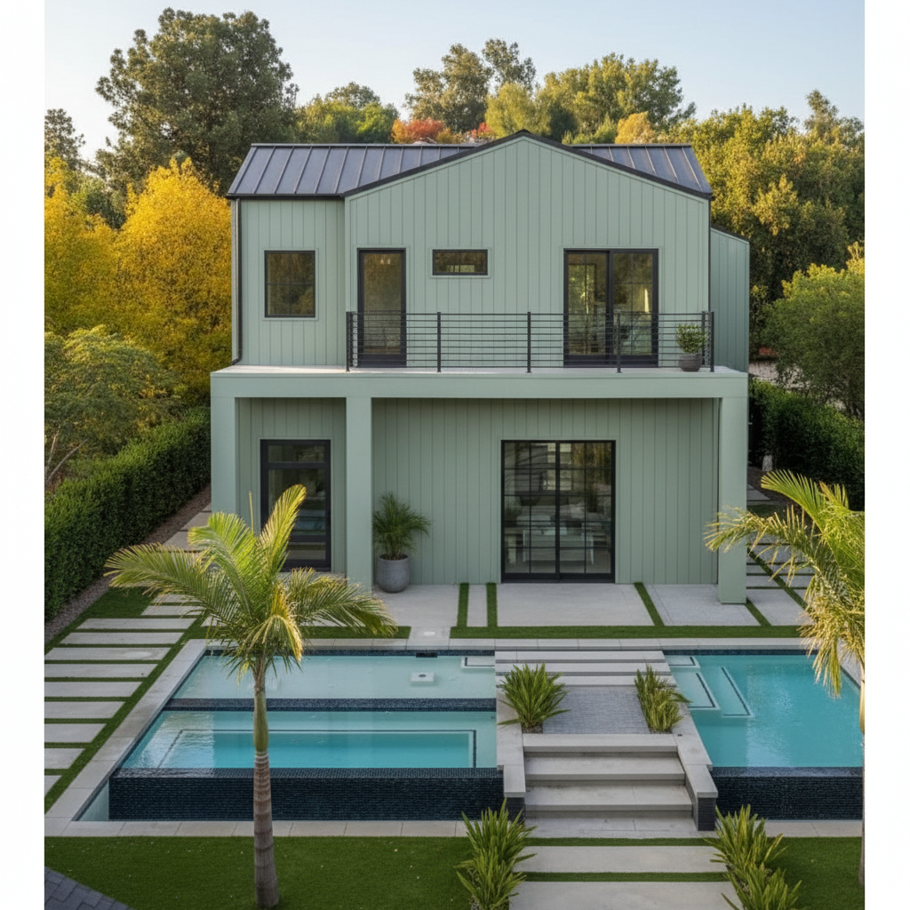 make the image a high resolution architectural photograph suitable for large format print fine natural grain no over sharpening make the image hyper realistic architectural photography keeping the same proportion and volumes colours and textures with soft diffused daylight and soft sun shadows and true tones the overall atmosphere of the visual shall have a calm and airy feeling beneath the 5 arches there is a water pool remove the tiny grey object on the floor the green concrete floor shall have barely perceptible reflection and an overall quiet contemplative mood take aerial perspective into consideration the background is lighter than the foreground so that there is depth in the image