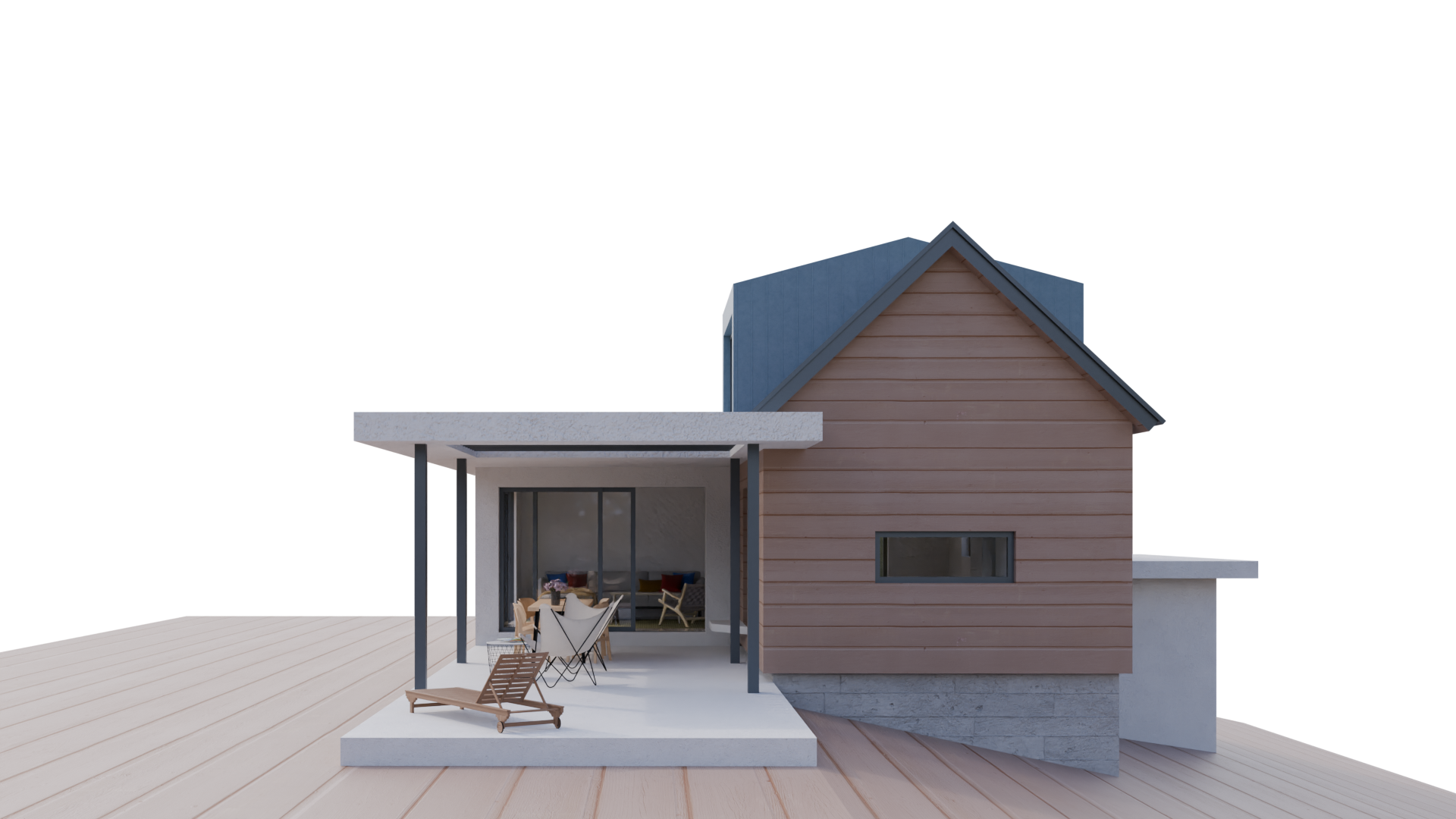 render a photorealistic 3d perspective of this house in rural setting next to tall pine trees background of attached image reference the current material style just enhance all used materials keep model geometry the same windows doors roof walls terrace make a natural lawn setting on terrain geometry in attached picture that looks native to croatian zagorje region do not change the view only enhance the current materials and make the landscape nicer vegetation detailed textures in the wood siding and glass reflections and a vibrant clear sky with light atmospheric depth render in hyper realistic architectural visualization quality 8k resolution