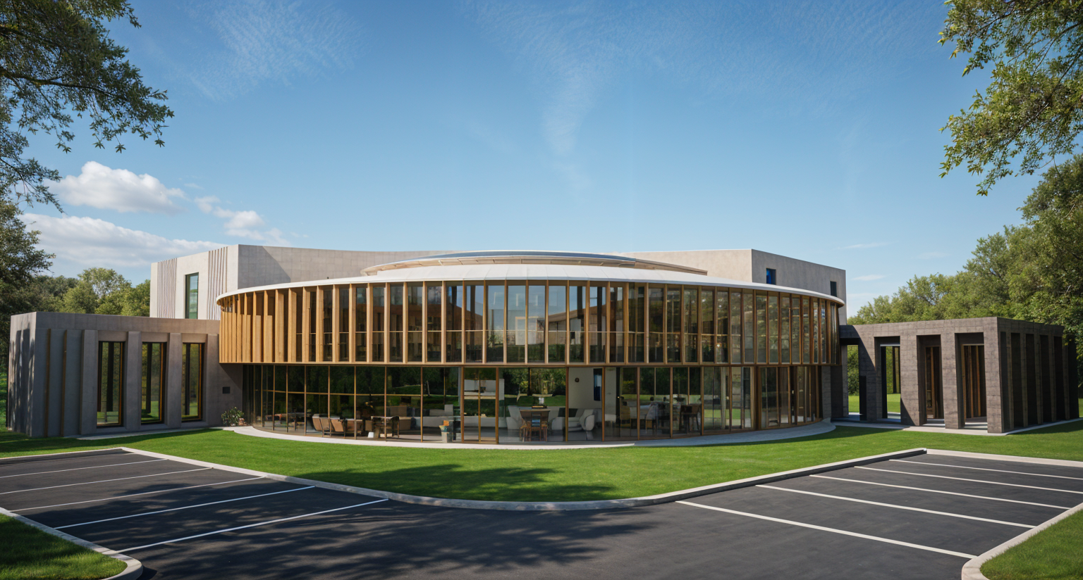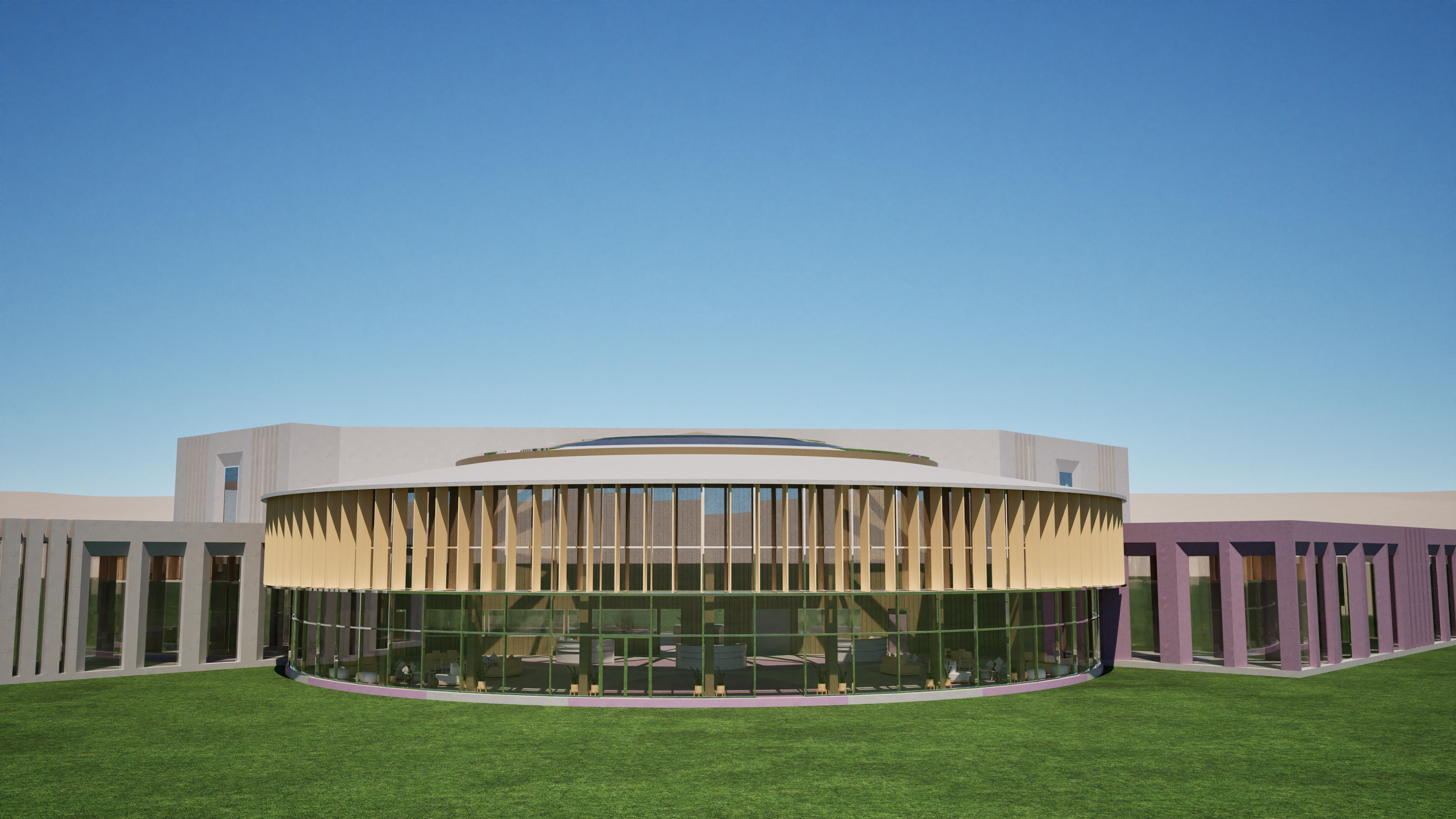 help me improve the rendering and add greenery and a parking lot keep the pink in the building