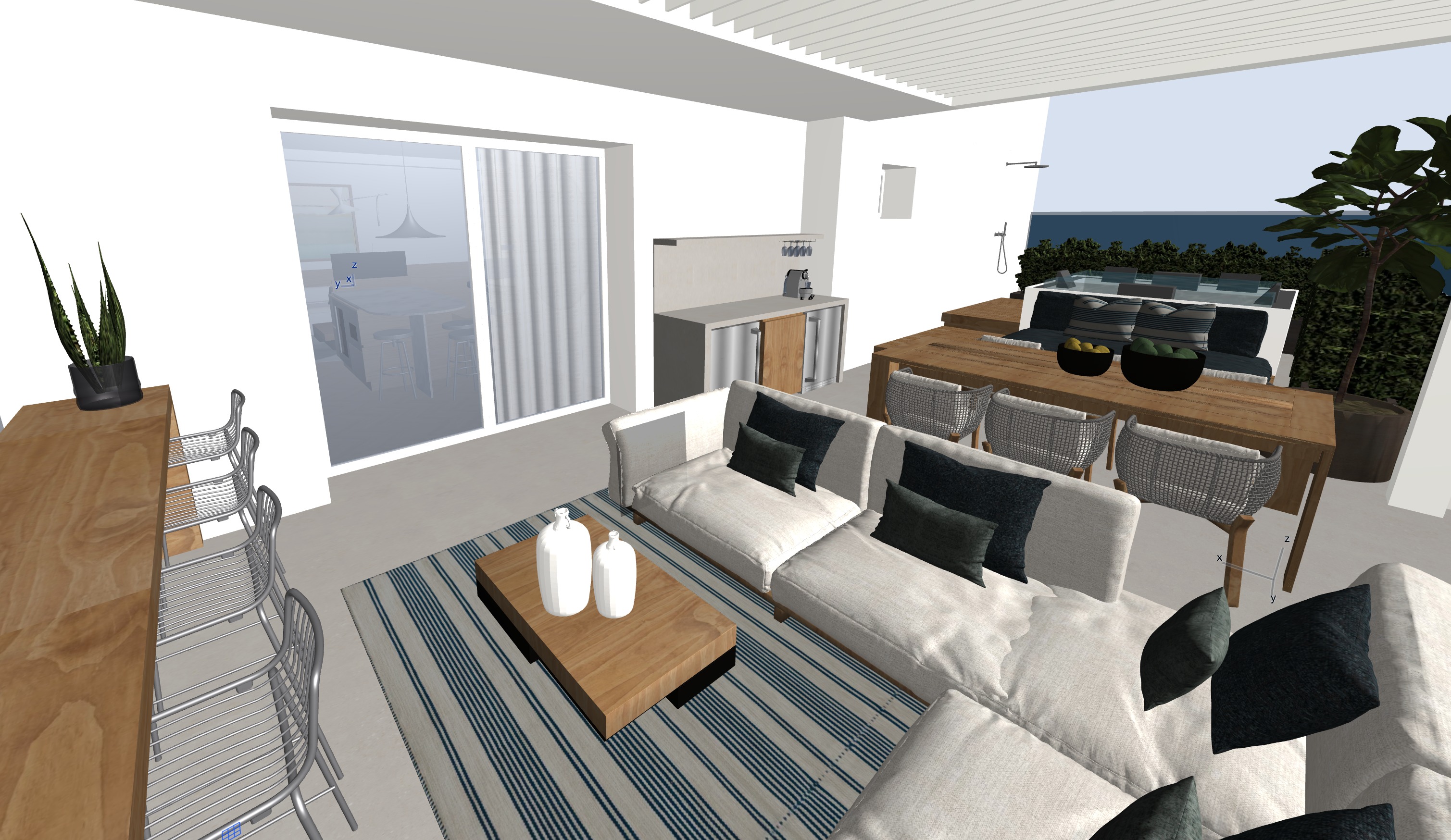terrazza con divano in tessuto bianco caldo e cuscini sui toni del blu scuro tavoli e tavolini in legno teak e cucina con piano di lavoro fianchi e mensola in gr s effetto pietra gli sgabelli e gli elettrodomestici della cucina sono cromati la mensola della cucina ha una strip led sotto che illumina il piano di lavoro nella pergotenda sopra al divano c una strip led incassata perimetrale accesa il gradino della pedana in legno della vasca idromassaggio ha una strip led attorno alla vasca idromassaggio ci sono delle siepi metti uno sfondo con case con chiome di alberi e colline in lontananza al tramonto metti qualche oggetto per ambiente conviviale esterno