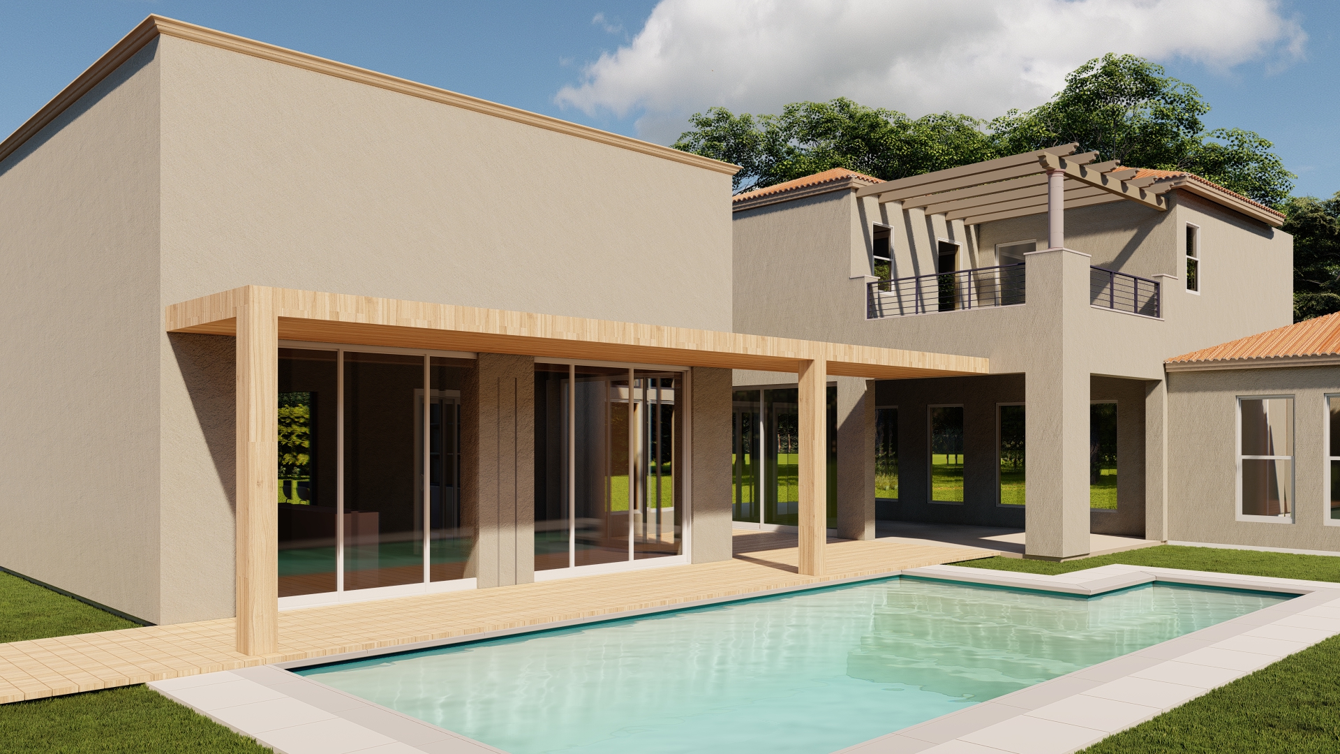 hiperrealistic architectural render of a modern house featuring an exterior wooden canopy structure the canopy is supported by solid natural wood columns with visible grain texture and warm tones the design blends contemporary architecture with organic materials large glass windows and clean geometric lines soft natural daylight realistic shadows and global illumination surroundings include a minimal landscaped garden with grass stone pathways and subtle vegetation ultra detailed materials photorealistic lighting high resolution cinematic composition depth of field 8k quality realistic reflections architectural visualization styl