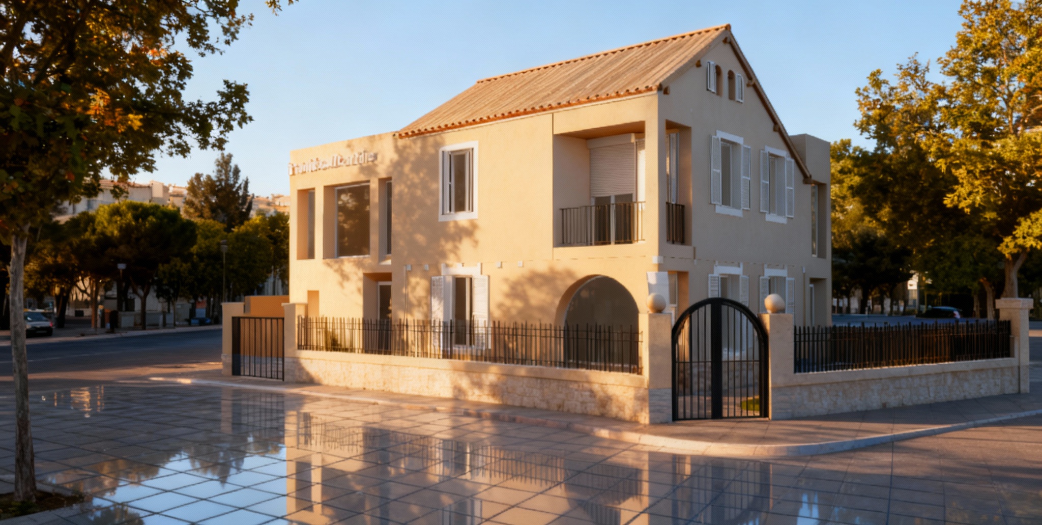 kitchen cabinets are light mat gray with gold handles room appears in warm natural daylight exend the rug under the couch at table