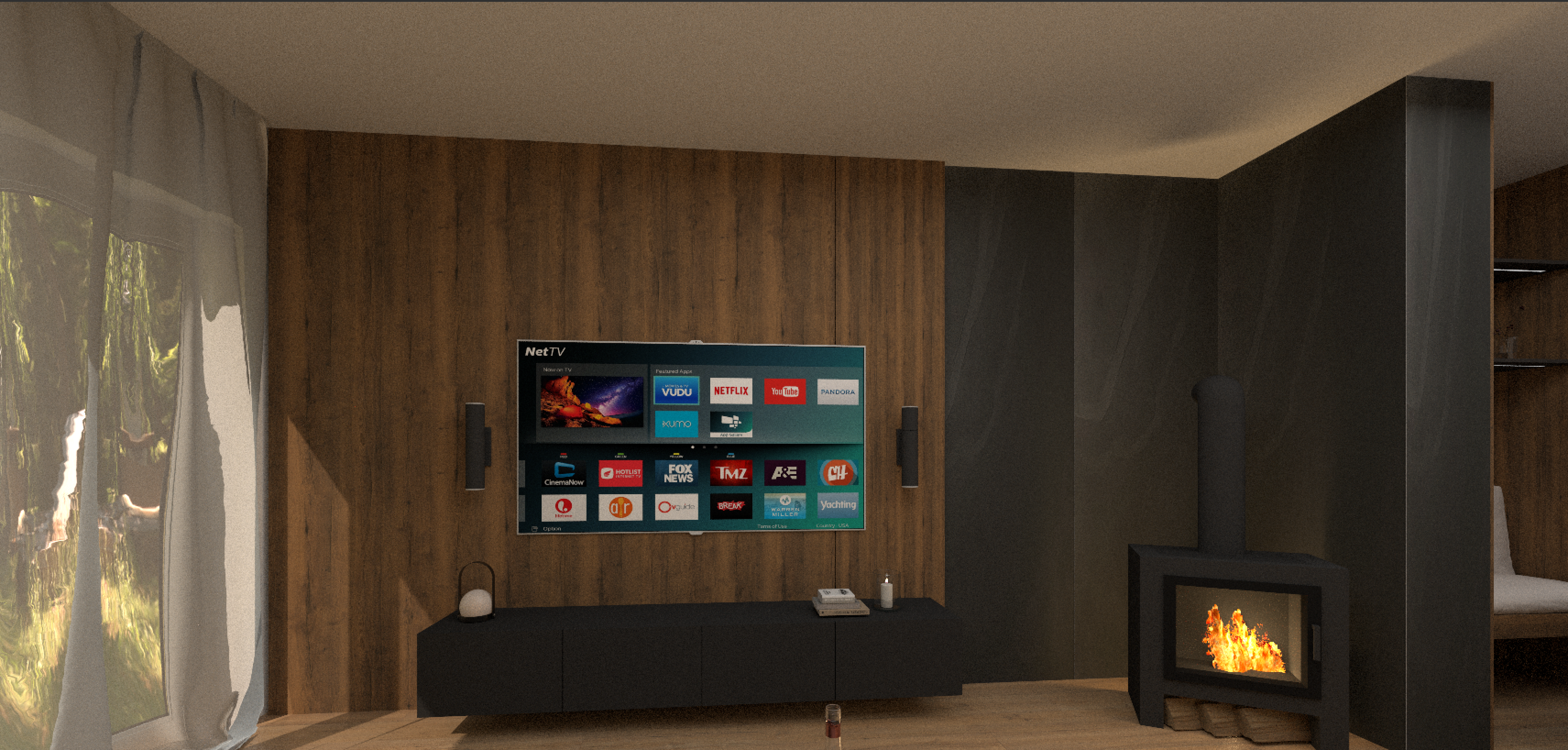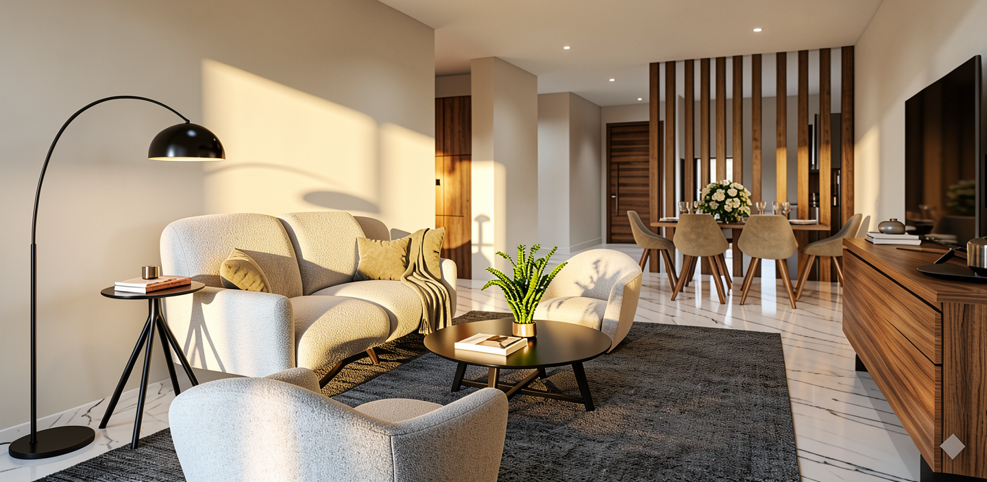 improve the realism of the interior render while keeping the exact layout camera angle and furniture placement unchanged enhance natural daylight add soft warm led lighting 3000k to shelves and under cabinets improve material textures and reflections add subtle realistic decorations books ceramics plants in balance with the design increase contrast depth and shadows for a premium architectural visualization keep the space elegant minimal and realisti