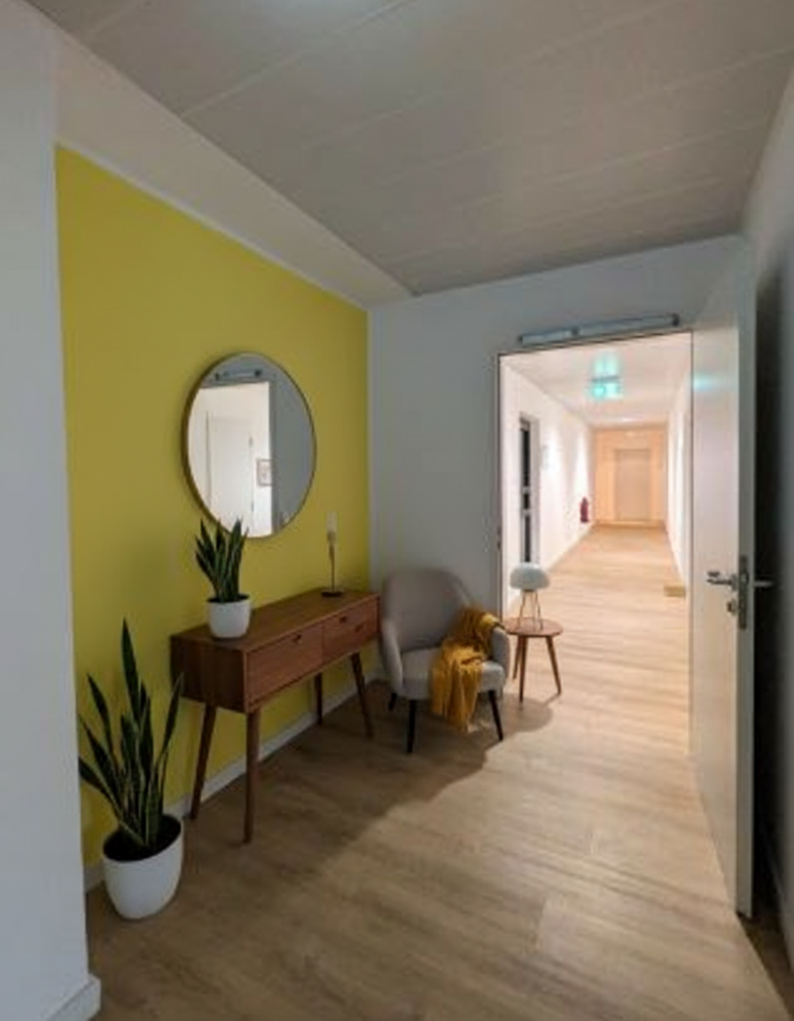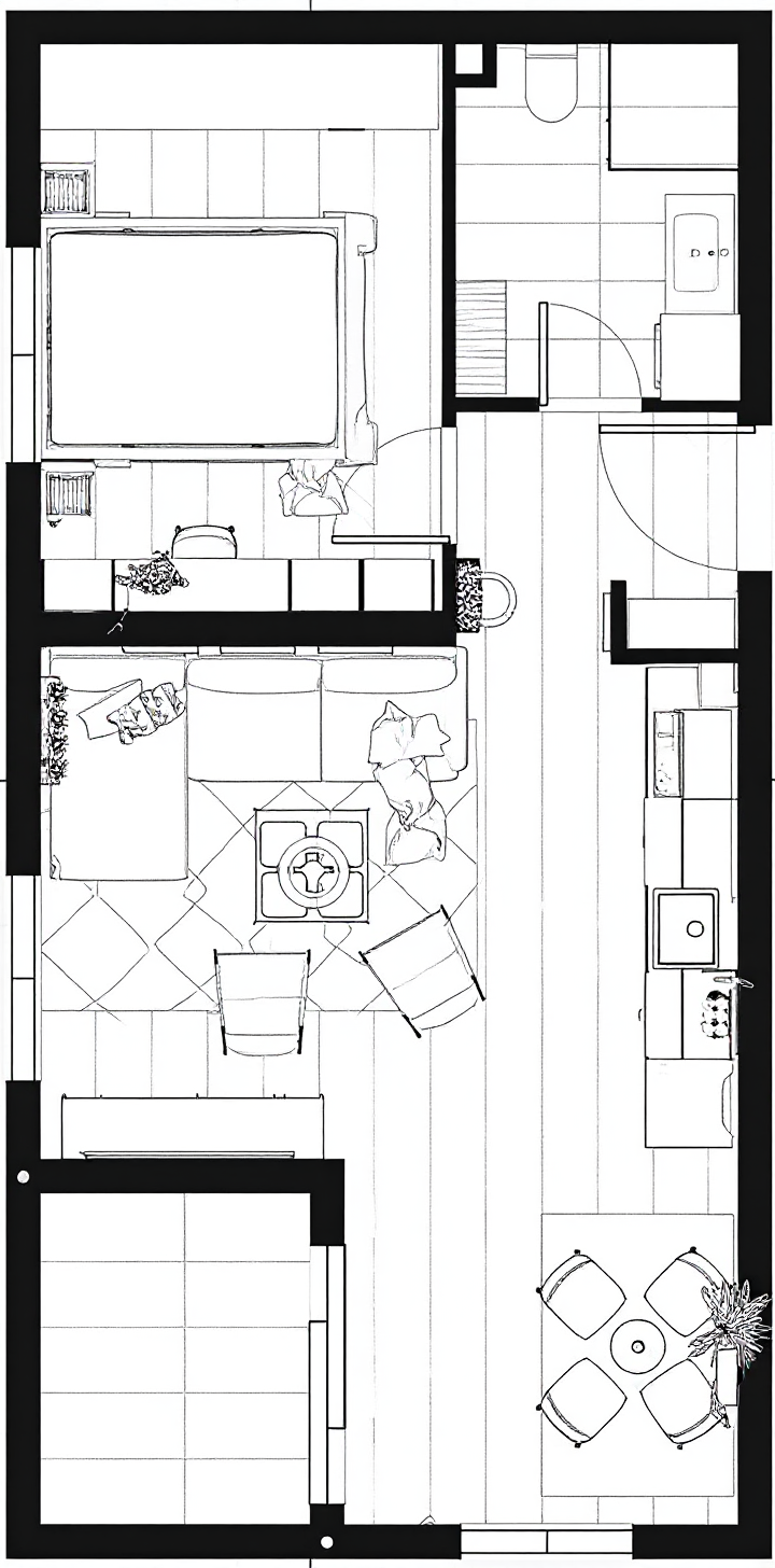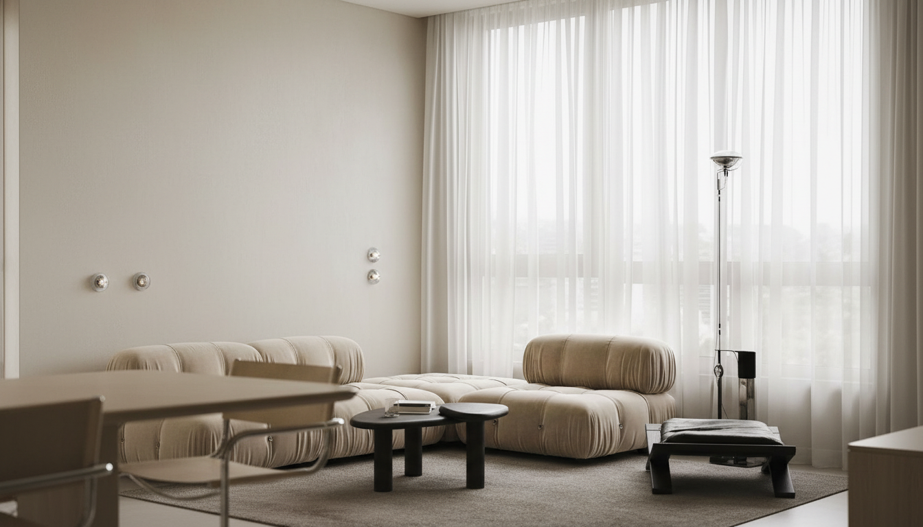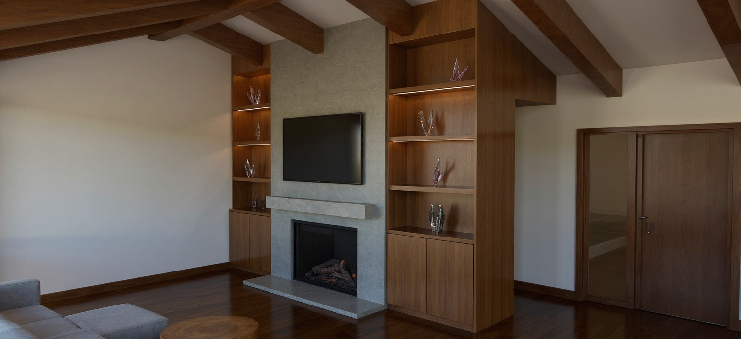 render a modern living room with a cozy warm atmosphere use light oak for the wooden beams and shelves the walls should be a crisp white contrasting with a textured light gray for the fireplace wall the television is mounted above the fireplace with a subtle black frame include a light oak mantelpiece the floor is a rich dark walnut wood the sliding door has a sleek black frame soft ambient lighting creates a welcoming feel prioritize natural material textures and subtle harmonious color contrasts