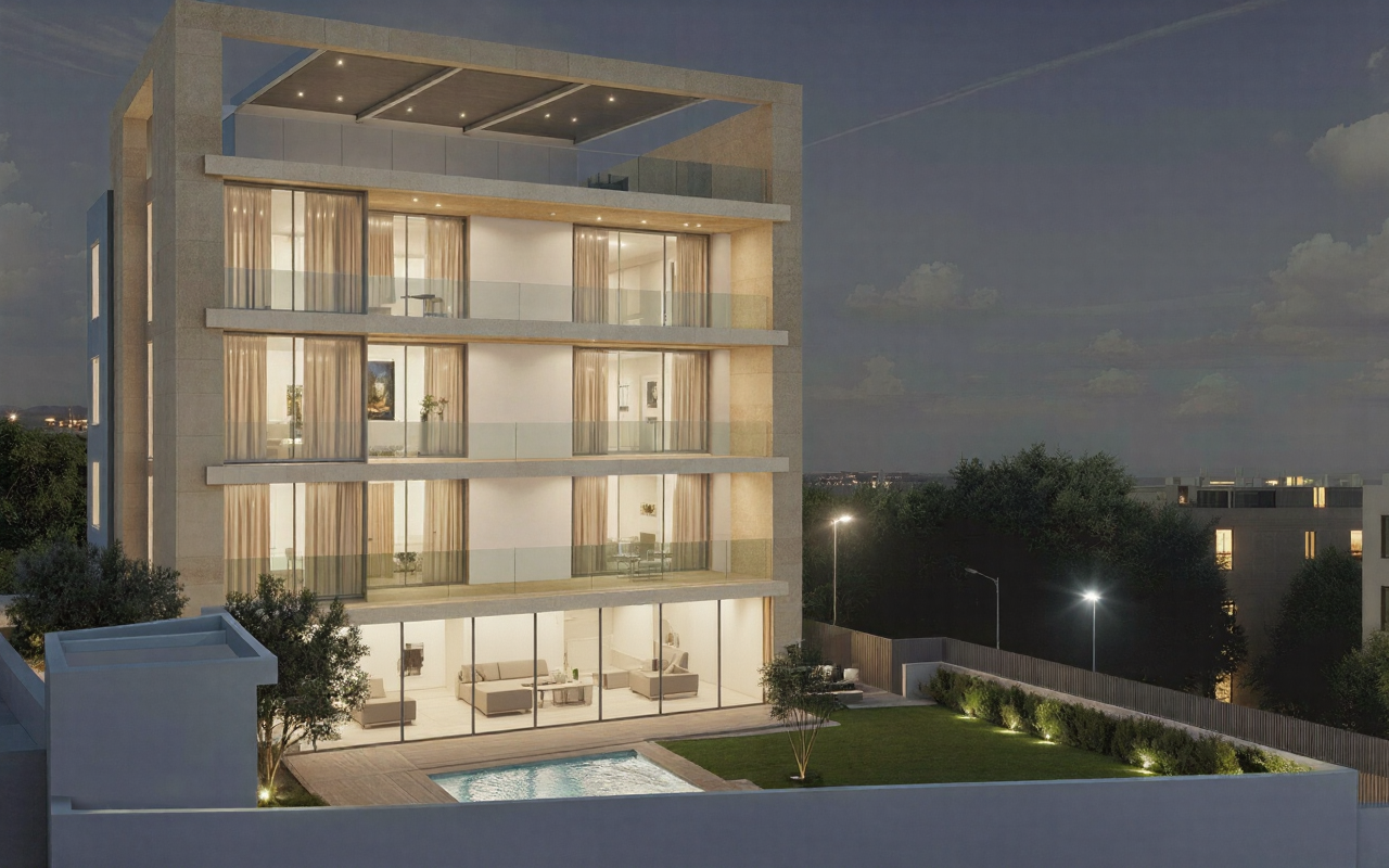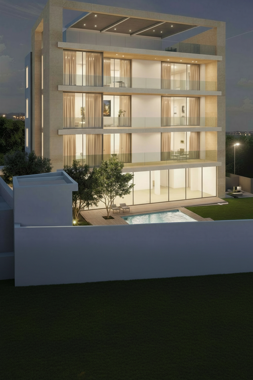 add only two people nothing else 1 person on balcony add one delicate realistic person standing on a balcony correct human scale relative to the railing soft neutral clothing light beige cream soft grey natural skin tone subtle appearance not dark not high contrast no dresses no black clothing no dramatic outfits softly illuminated by the existing night lighting 2 person on ground floor add one person near the ground floor terrace area close to the building correct scale do not make them large soft neutral colored clothing no black no bright colors no dresses natural posture placed where they are visible in light not in deep shadow 3 do not place people no one near the fence no one on the lawn far from the building no extra people anywhere 4 strict do not change anything else no changes to materials lighting travertine glass furniture landscaping trees no changes to colors reflections shadows or sky no changes to camera angle or composition only add the two described people in the specified locations