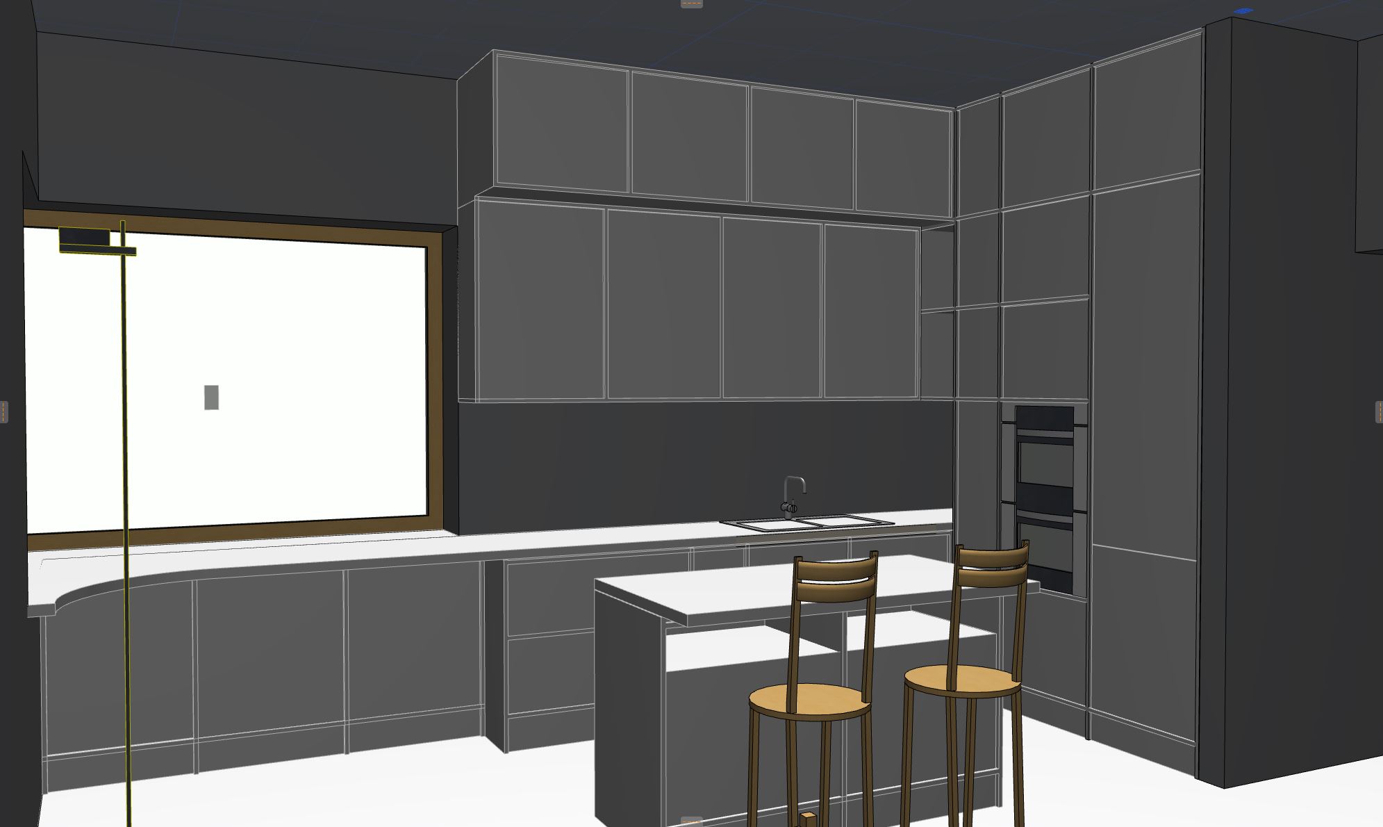 photorealistic kitchen interior visualization based on an existing unchanged 3d model strictly preserve the original geometry layout proportions cabinet positions island size ceiling design and built in appliances do not redesign or reinterpret the model apply materials colors textures and lighting inspired by the reference image only modern minimalist kitchen with warm elegant atmosphere tall cabinetry in soft matte light beige finish with clean handle less fronts lower cabinets and kitchen island finished in vertical natural oak wood veneer with subtle texture large format stone backsplash and wall panel with expressive natural marble pattern in warm beige sand gray and dark mineral accents extending from countertop to upper cabinets integrated warm backlighting highlighting the stone texture kitchen island with light stone countertop waterfall edge and wooden base upholstered bar stools with soft beige fabric seats and slim black metal legs built in appliances seamlessly integrated into wooden cabinetry minimalist black electrical outlets and fixtures brushed metal kitchen faucet in warm metallic tone ceiling with recessed linear lighting and black track lights soft indirect illumination realistic shadows global illumination neutral tiled floor in light warm gray tone camera eye level interior view realistic perspective natural depth same spatial logic as the original 3d model ultra high resolution photorealistic cinematic lighting interior design visualization no people