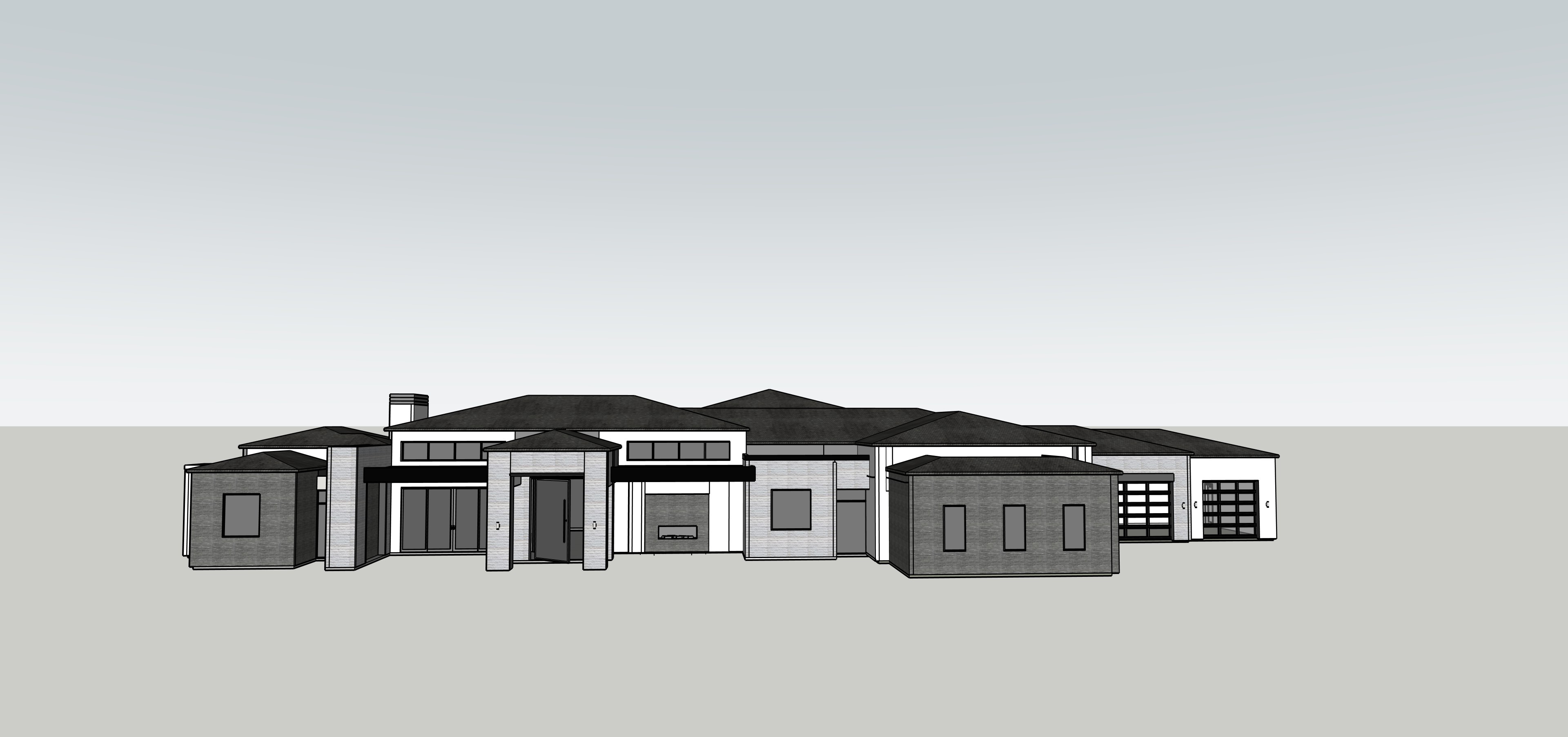 exterior of home in arizona white stucco white split face stone grey linear brick long walkway to front door left side of front door is patio with table and chairs right side is a fireplace with sofa and chairs
