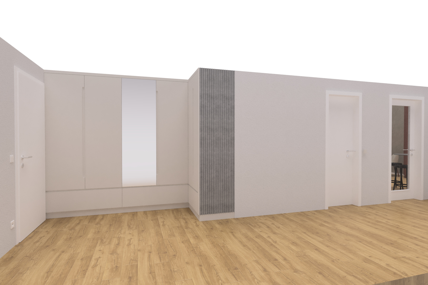 improve the realism of the provided interior render while strictly preserving the original composition and architectural intent strict rules must follow do not change camera framing proportions or geometry do not add remove or redesign any elements do not introduce any new light sources do not add led strips hidden lighting cove lighting or glowing ceilings the result must be based only on the provided image material and color specifications walls light white plaster subtle texture matte finish floor natural oak wood flooring warm tone realistic grain and subtle imperfections built in wardrobes light white chalk painted finish matte soft texture decorative wall panels grey concrete panels fine texture slightly rough realistic imperfections doors light white matte finish door handles brushed stainless steel realistic reflections subtle roughness light switch light white power socket light white lighting very important use only artificial lighting from ceiling downlights recessed spotlights light must clearly originate from downlights above no led strips no indirect ceiling glow no hidden lighting light should fall naturally onto walls doors wardrobes and floor create realistic light cones and soft falloff from downlights temperature neutral warm 3000 3500k add realistic shadows especially along the base of wardrobes in corners around door frames subtle ambient occlusion and contact shadows required rendering quality enhance global illumination and indirect bounce light add micro imperfections and realistic material response pbr improve depth and contrast while keeping a natural look keep the scene clean and minimal no stylization or extra elements goal achieve a highly realistic interior render with believable artificial lighting from downlights accurate material definition and natural shadow behavior while staying fully faithful to the original image
