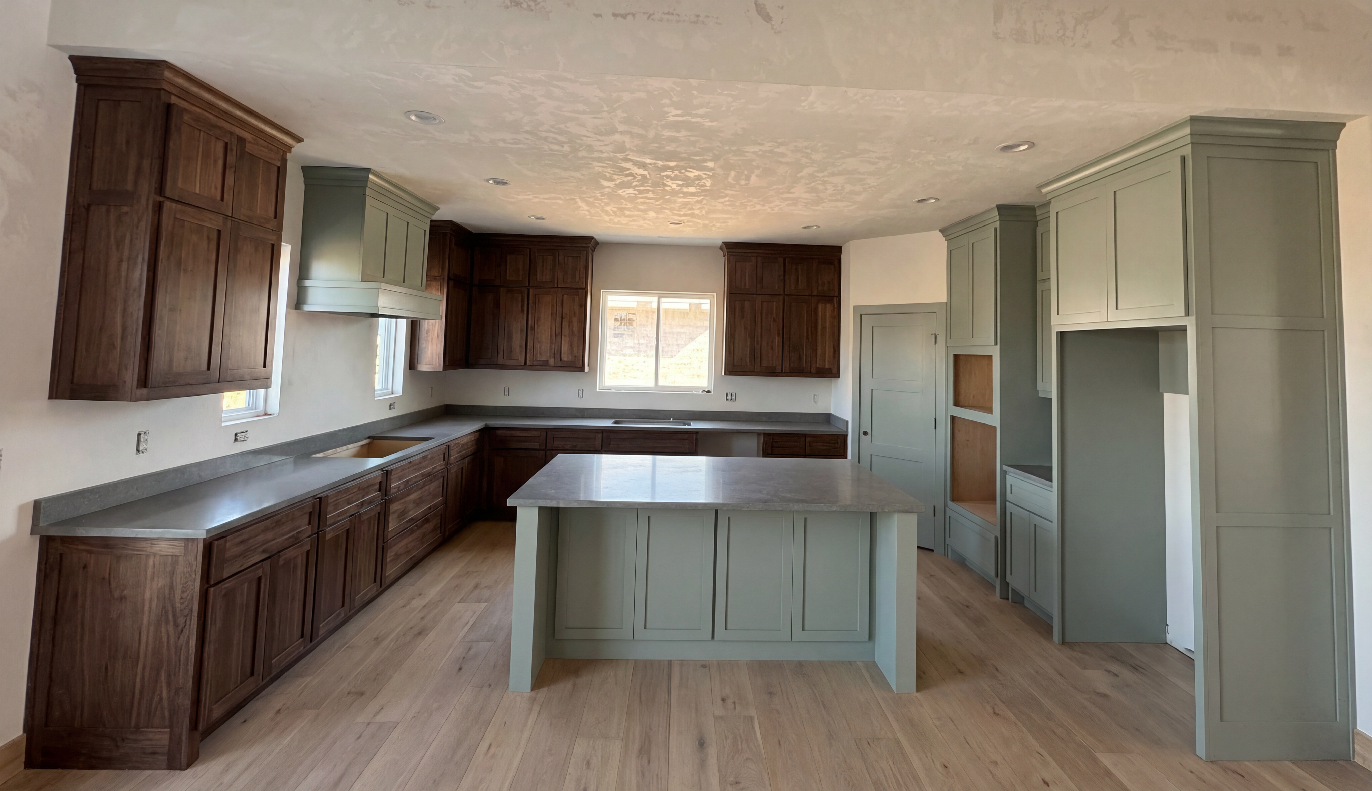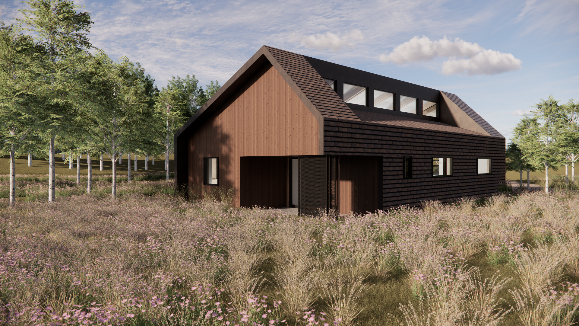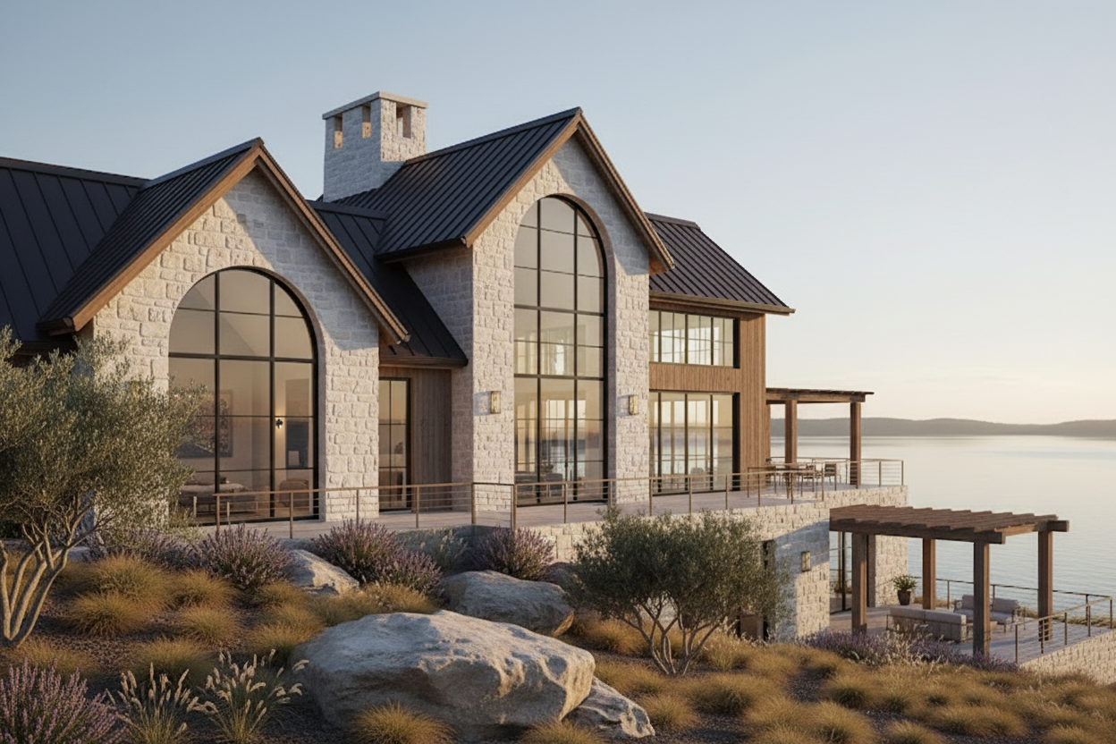 add variation to the landscape make realistic show orange glow from windows and covered deck