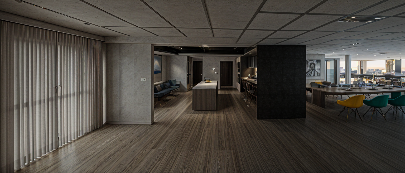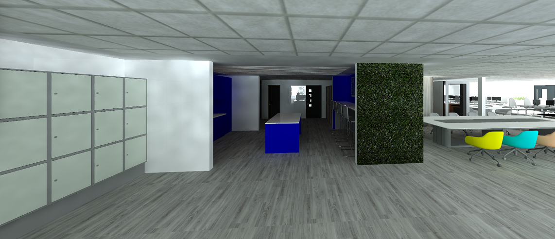 change flooring to grey carpet tiles change wall to white plaster walls on left side change colours of seating to more neutral shades change blue kitchen worktop to a navy dark blue
